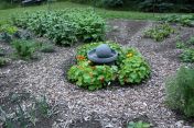 The circle has four quadrants (which were further subdivided into pie-shaped plots) set to the cardinal directions (north, east, south and west). Each direction has a corresponding element (earth, air, fire and water). The center of the circle is a place of concentrated ‘power’ and peace. At the door of the garden is a pile of stones found previously buried in the soil. Visitors are invited to take a stone, envision a prayer or request, wish or blessing, and imagine that they are putting it into the stone. Then they can place the stone in the center bowl. As I spend time each day working in the garden, I meditate, contemplate and pray. I sing songs, I laugh, I dance, I express gratitude for the earth’s abundance. I imagine this good energy being absorbed into the growing plants.