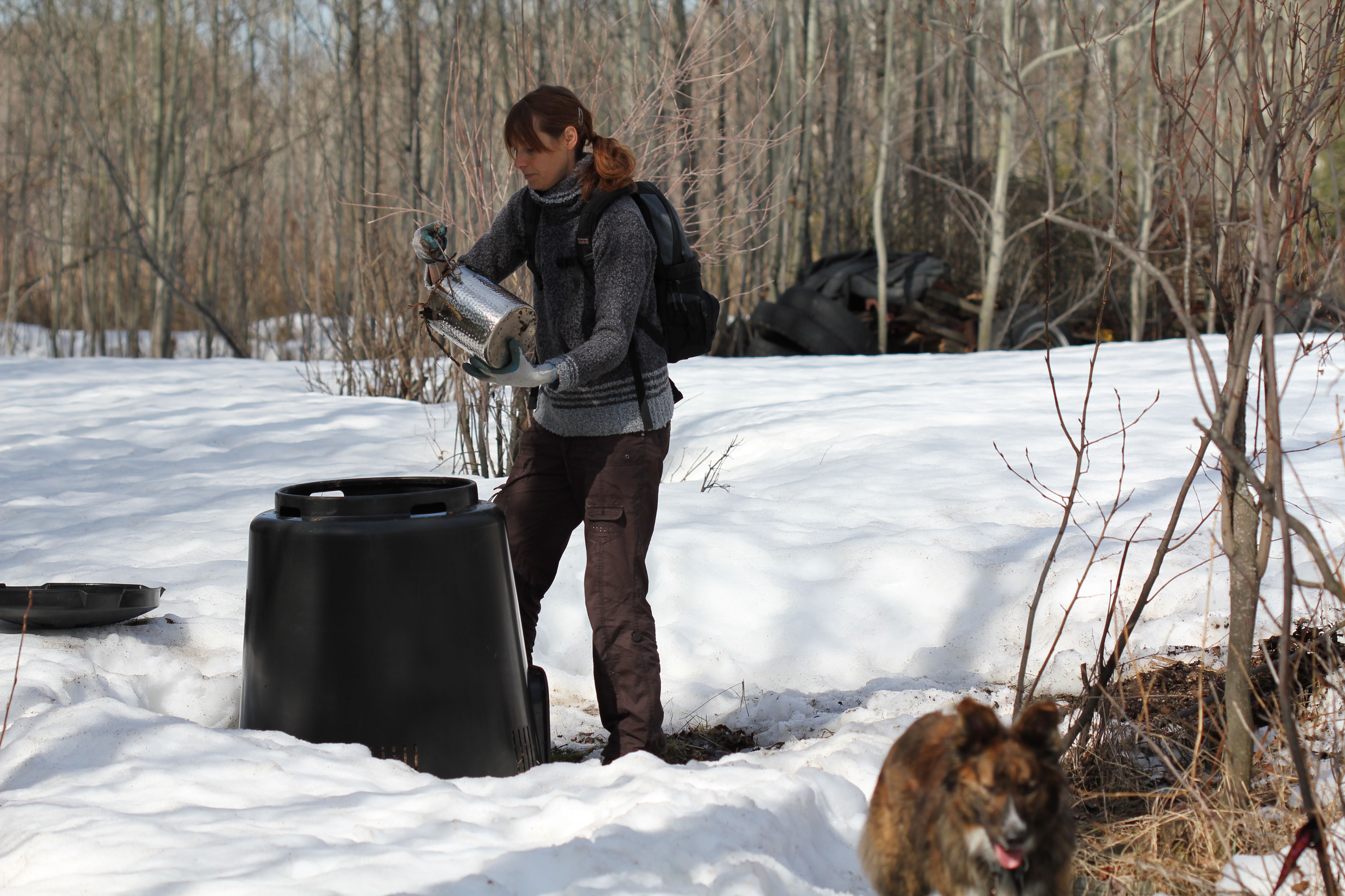 Yay! I have two composts going outside and a worm bin in my basement. I compost my kitchen scraps in this plastic bin so as not to attract wild animals. Point: 1