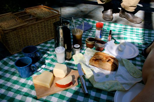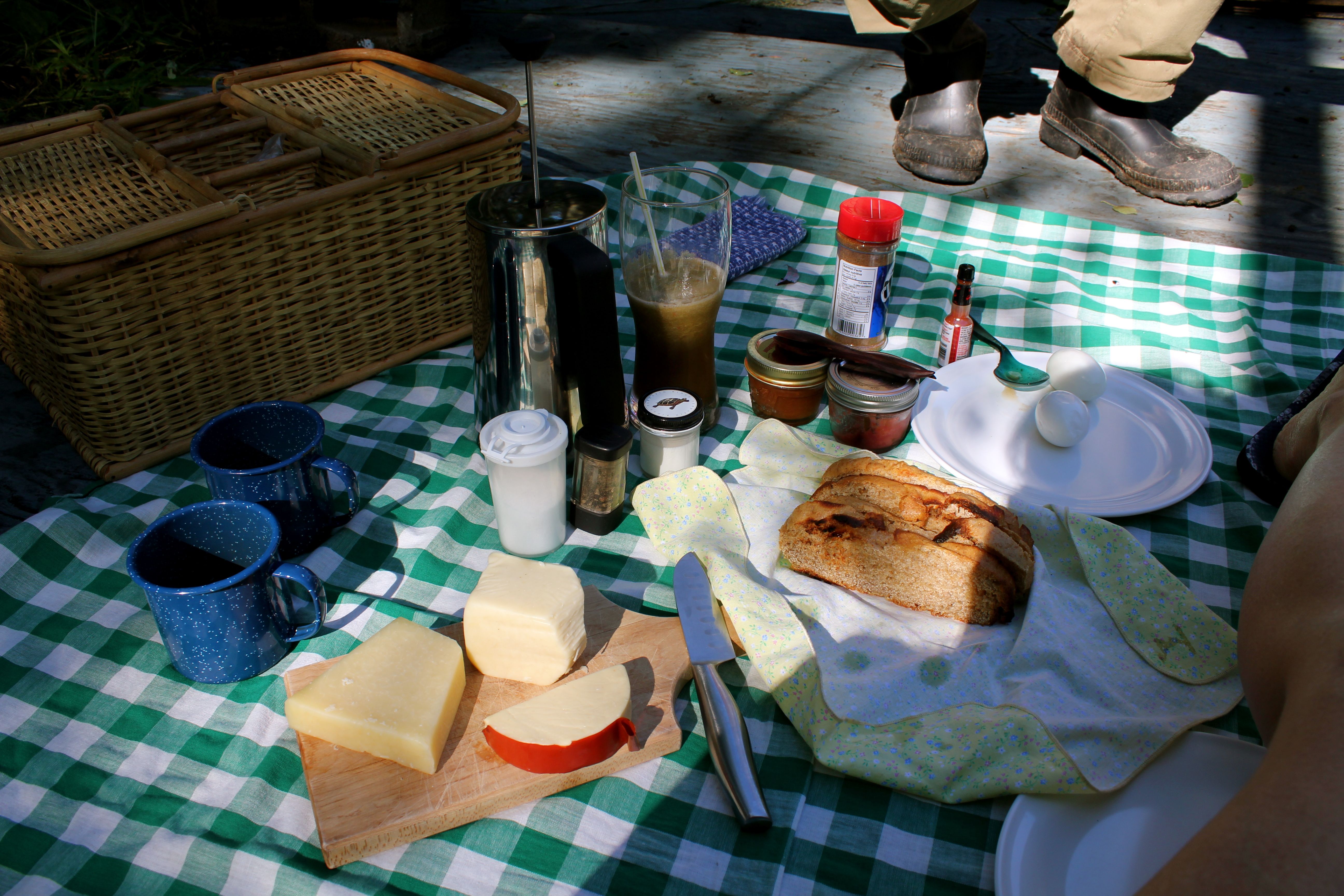 I have a sweet picnic basket that I found in a thrift store many years ago. It contains cloth napkins and picnic blanket, plastic reusable wine glasses, plastic, enamel camping mugs, plates and bowls, and camping eating utensils. Food is stored and transported in reusable containers. Point: 1