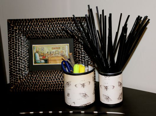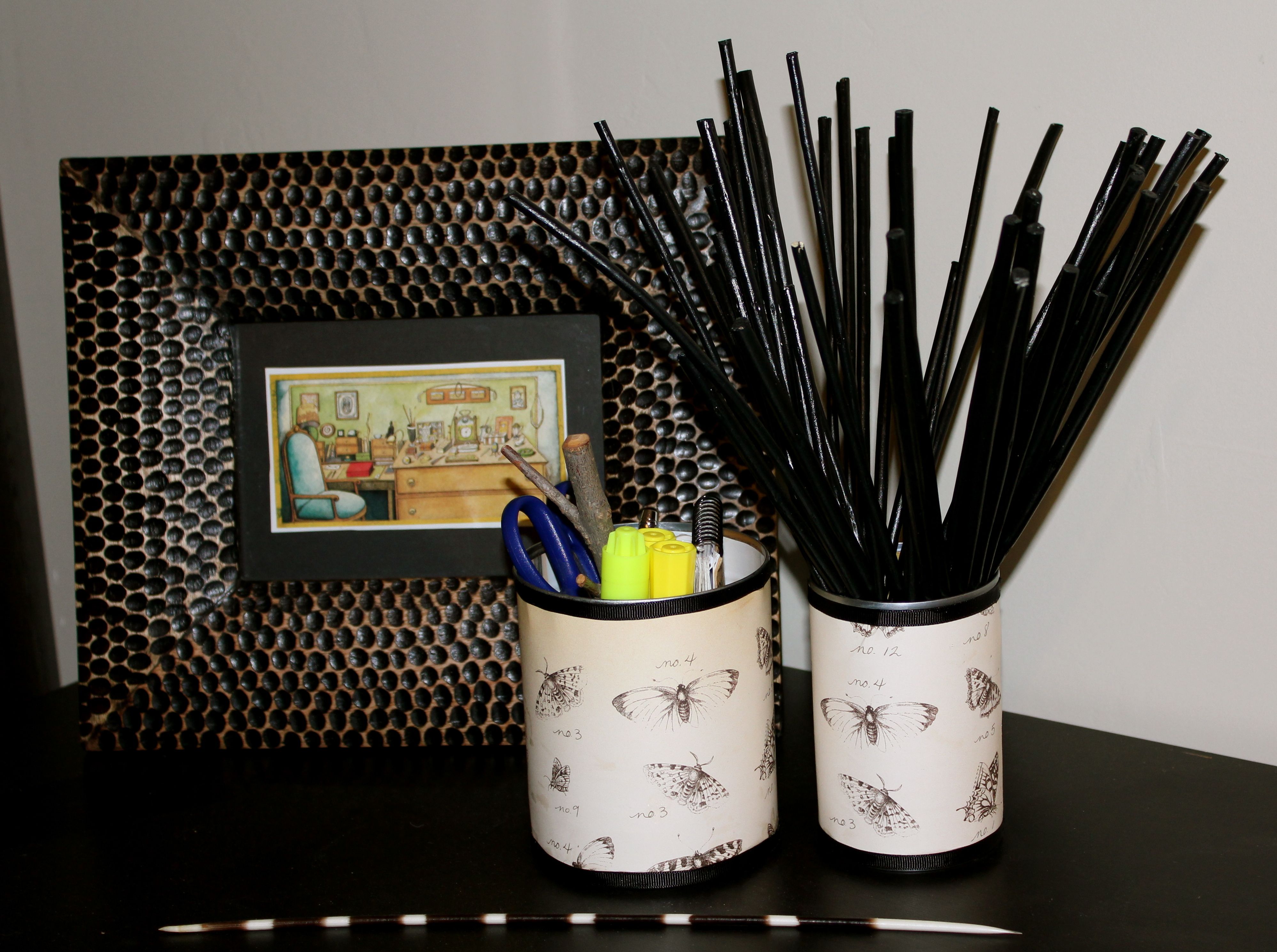 I do this constantly. Below are two tin cans that have been decorated with paper from Stampin’ Up to hold the pens on my desk. Point: 1