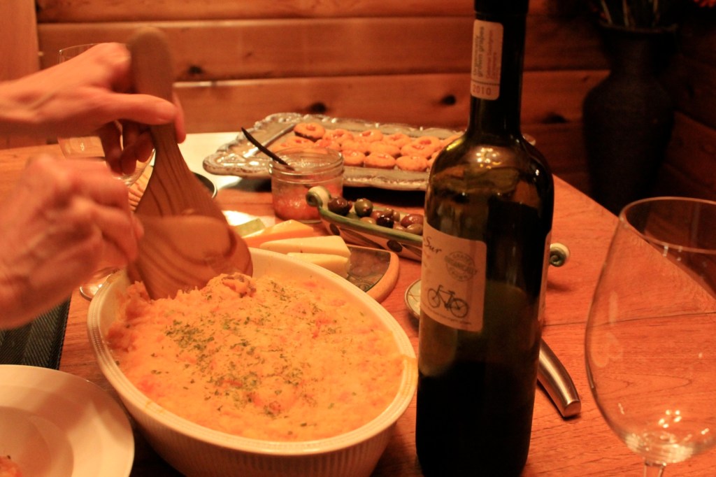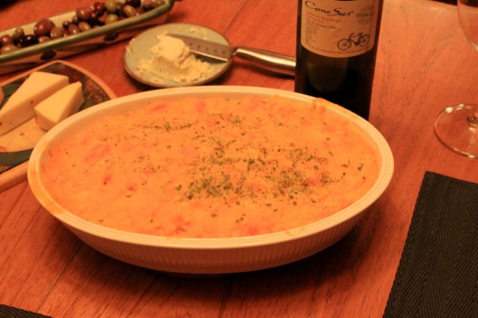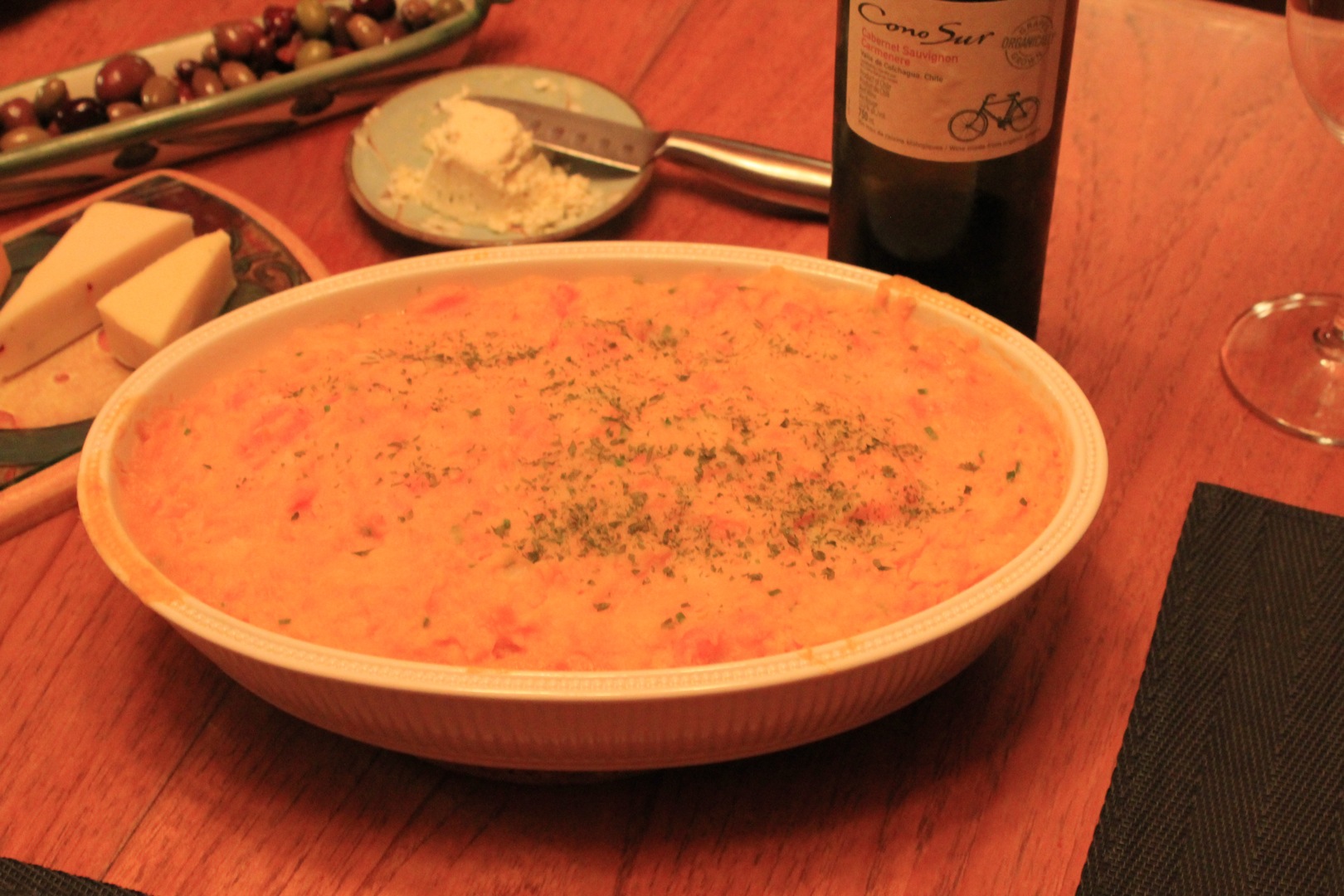 Saute green onions and ginger in butter for 2-3 minutes. Stir into mashed vegetables with milk, salt and pepper. Pile on top of the filling in the baking dish and smooth the top.