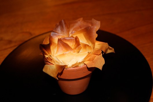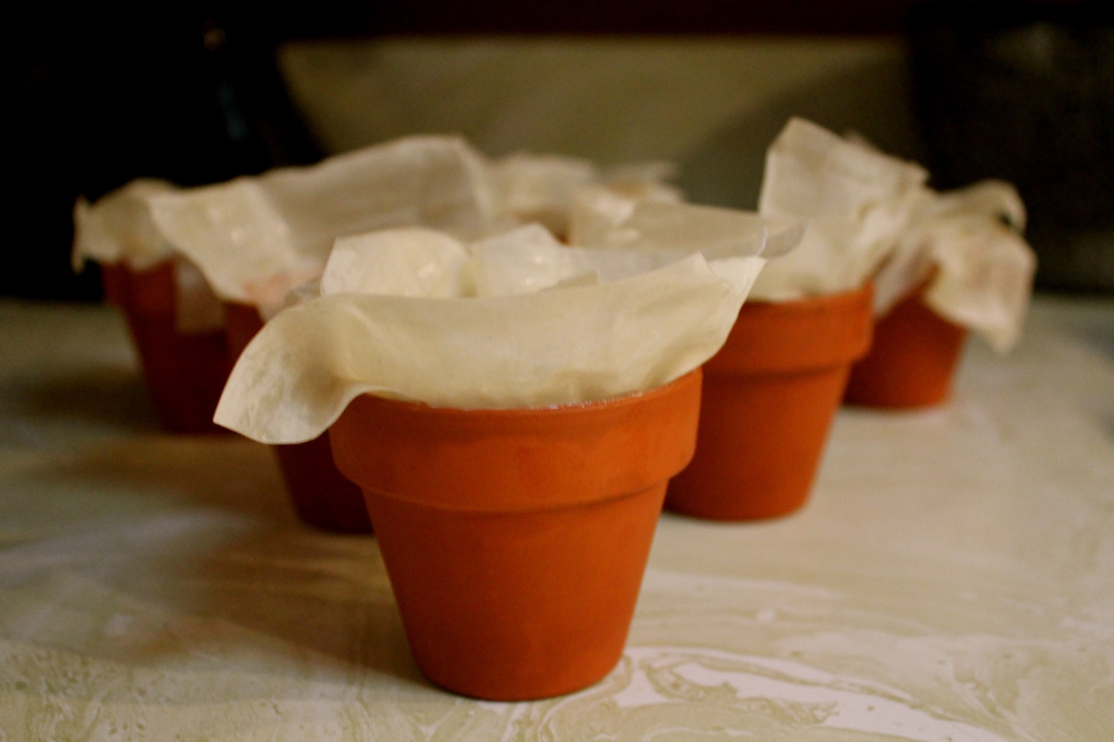 Unfold phyllo pastry and cover with a damp tea towel to prevent dough from drying out. Lay one sheet on a flat surface and cut into three equal pieces (I use a round pizza cutter). Brush the phyllo with melted butter and line each pot with 2 small pieces of the pastry.