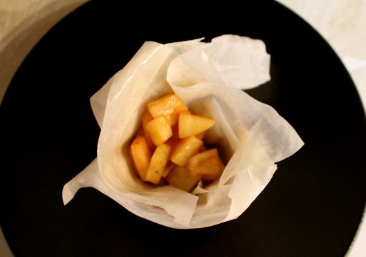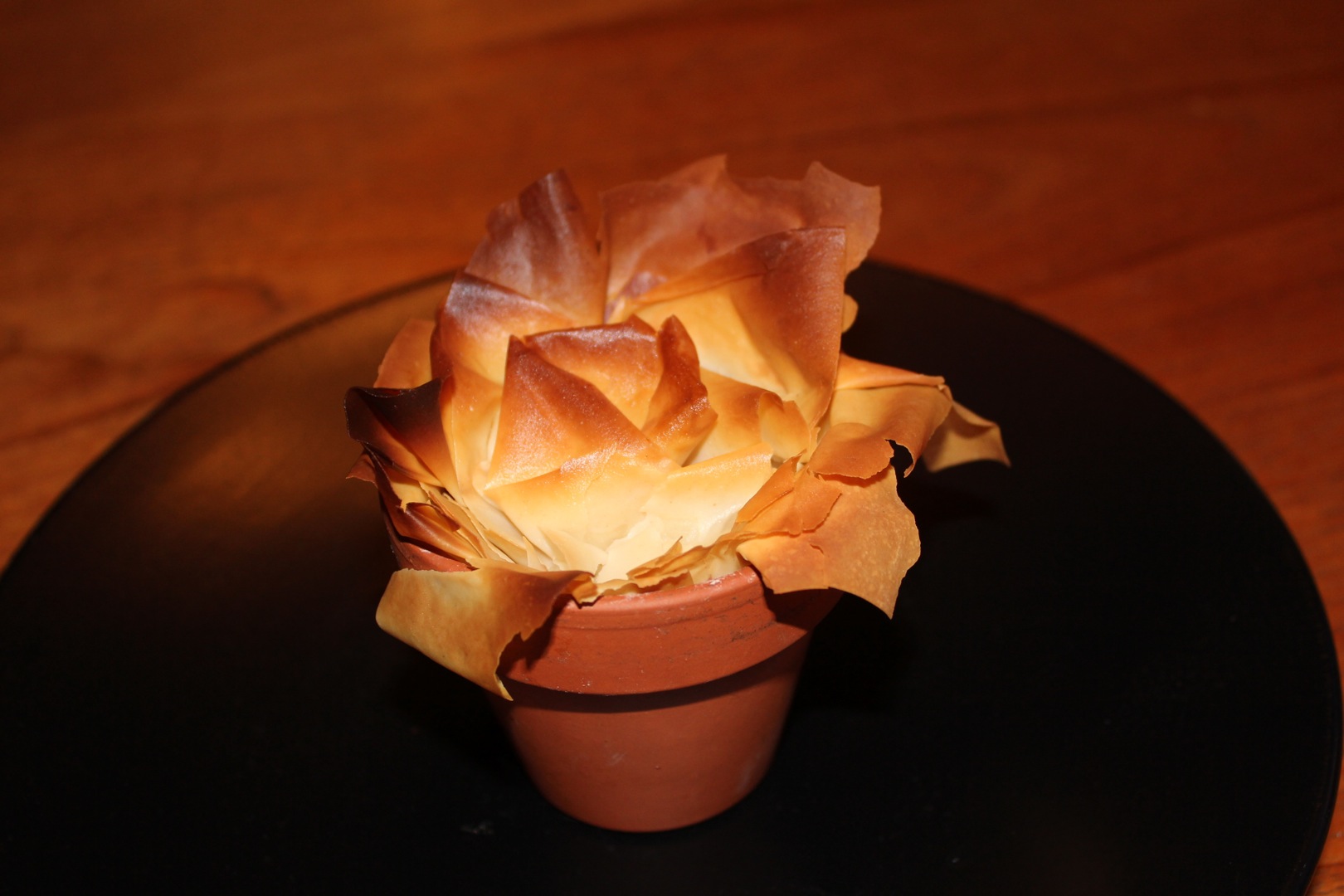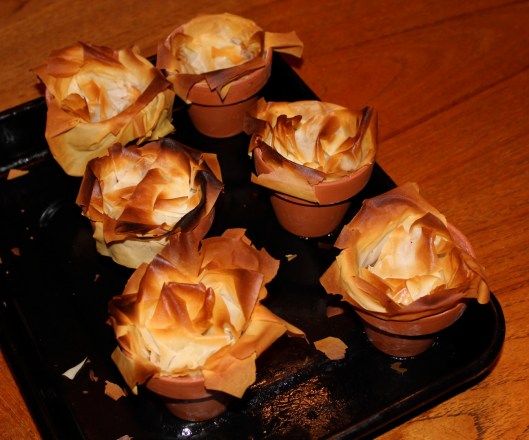 Fill each pastry-lined pot with about 1/4 cup of the apple mixture. Top with a small piece of buttered phyllo, crumpled up.