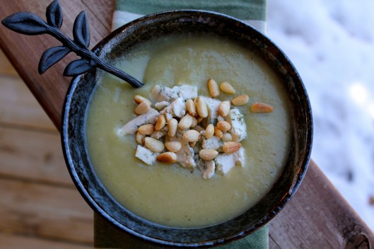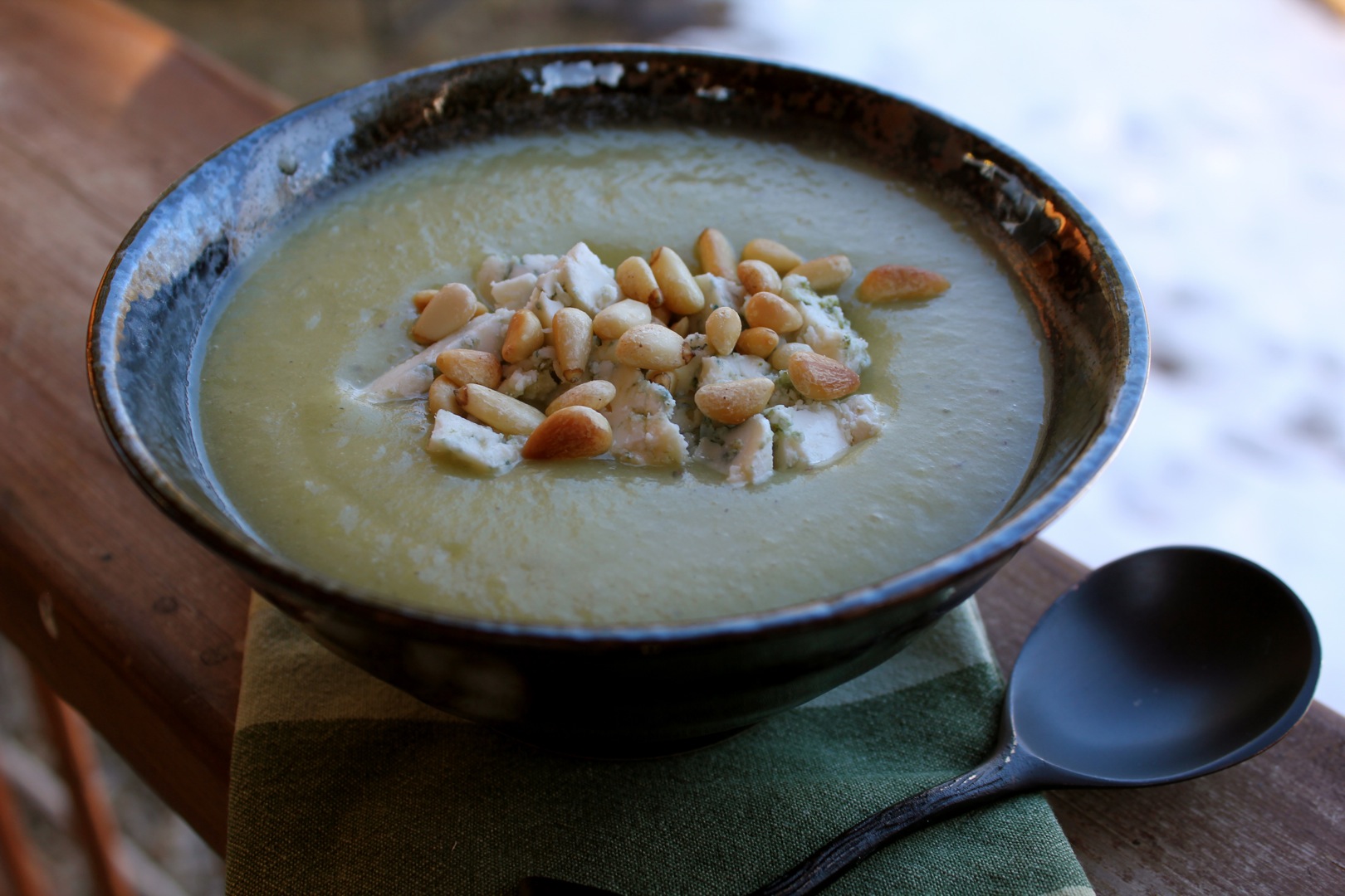 blue cheese, celery, celery soup, onion, pine nuts, potato, soup, vegetable soup, walnuts