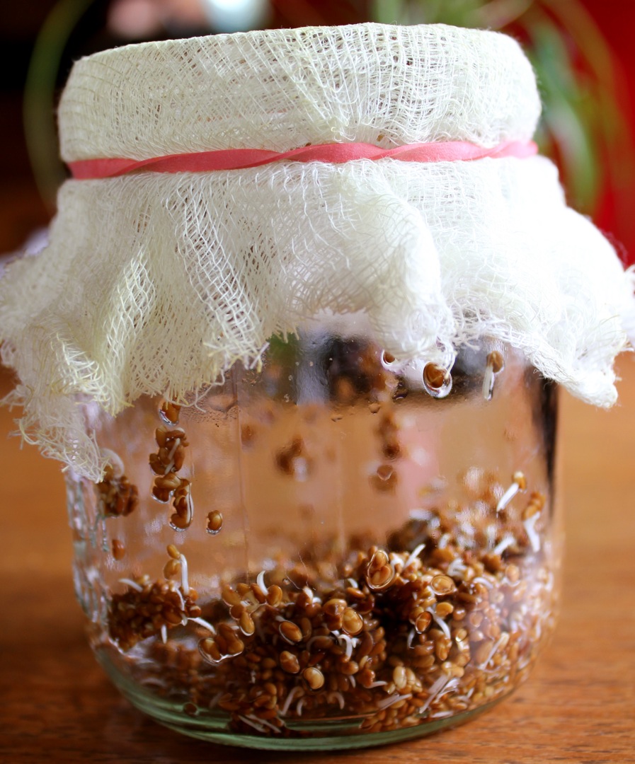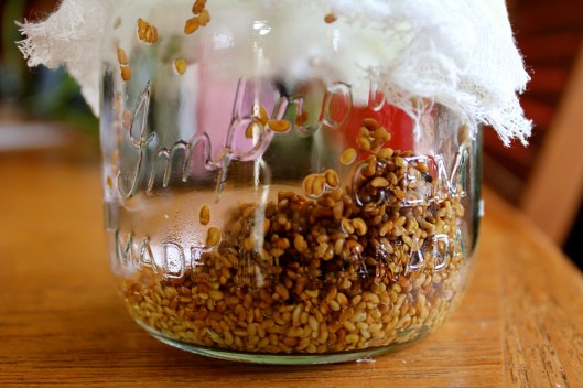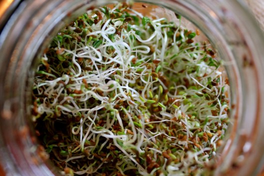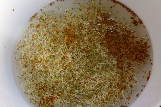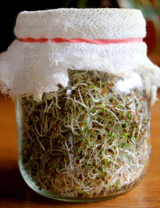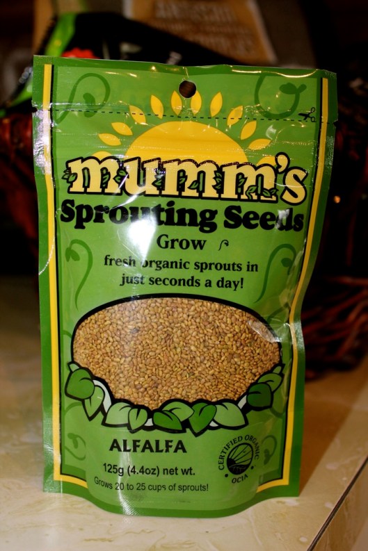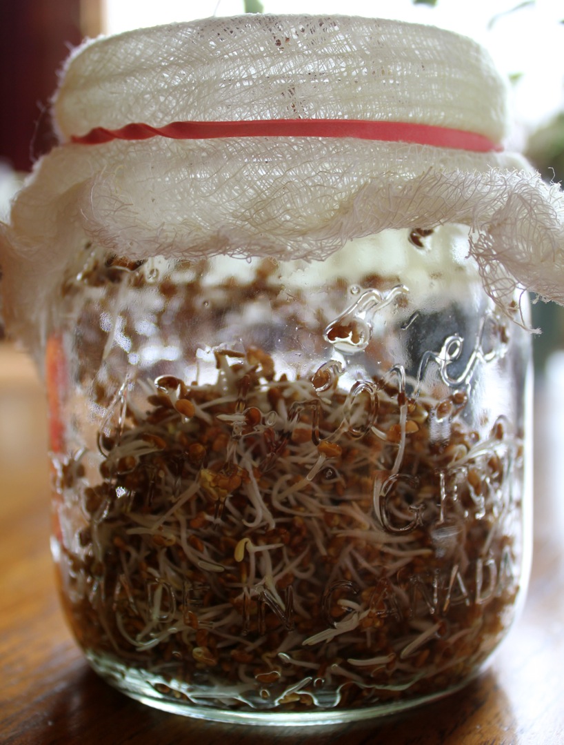 Sprouting seeds is easy and no special equipment is required besides a glass jar, some cheesecloth and a rubber band. I buy Mumm’s Seeds at my local health food store but I have also seen them at some grocery stores in the produce section. I paid $7 for this bag but it will grow between 20-25 cups of sprouts! To this day, I have only sprouted alfalfa seeds but this morning I was inspired by some youtube videos to broaden my experience and try sprouting other seeds, such as wheat berrries, mung beans, lentils, broccoli, and even quinoa. I am also keen to try baking sprouted grain bread and will post my progress once I start experimenting.