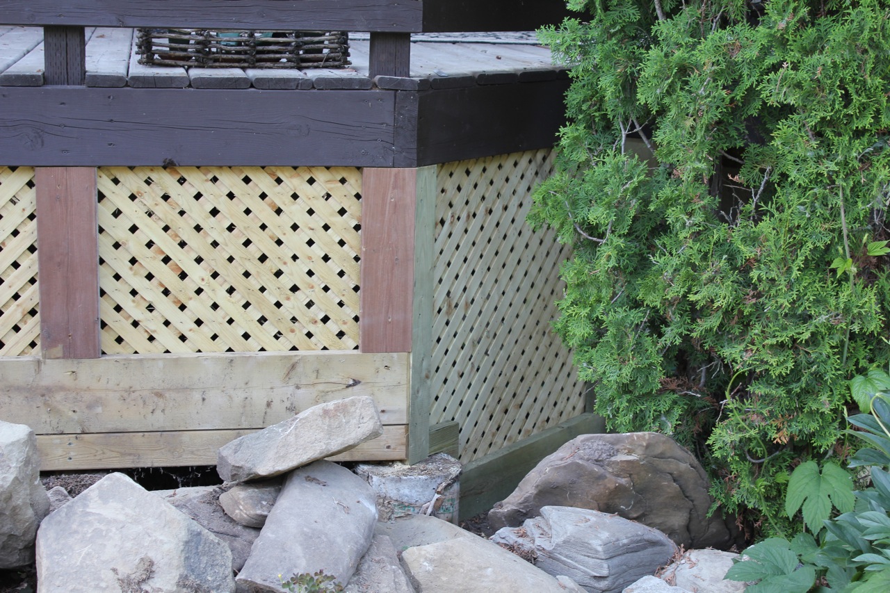 The rocks are piled quite high to high a gap in the boards. Brian decided to remove a few of these boards and install more trellis to match the patio trellis. He also kept going when he got to the cedar tree and added trellis to the decking behind and beyond the cedar. This was a lot of work and was tedious to install but was really worth it. It really makes the area feel cleaner as you no longer have to look at the uninspiring view under the deck. I also removed the metal fencing from around the cedar.