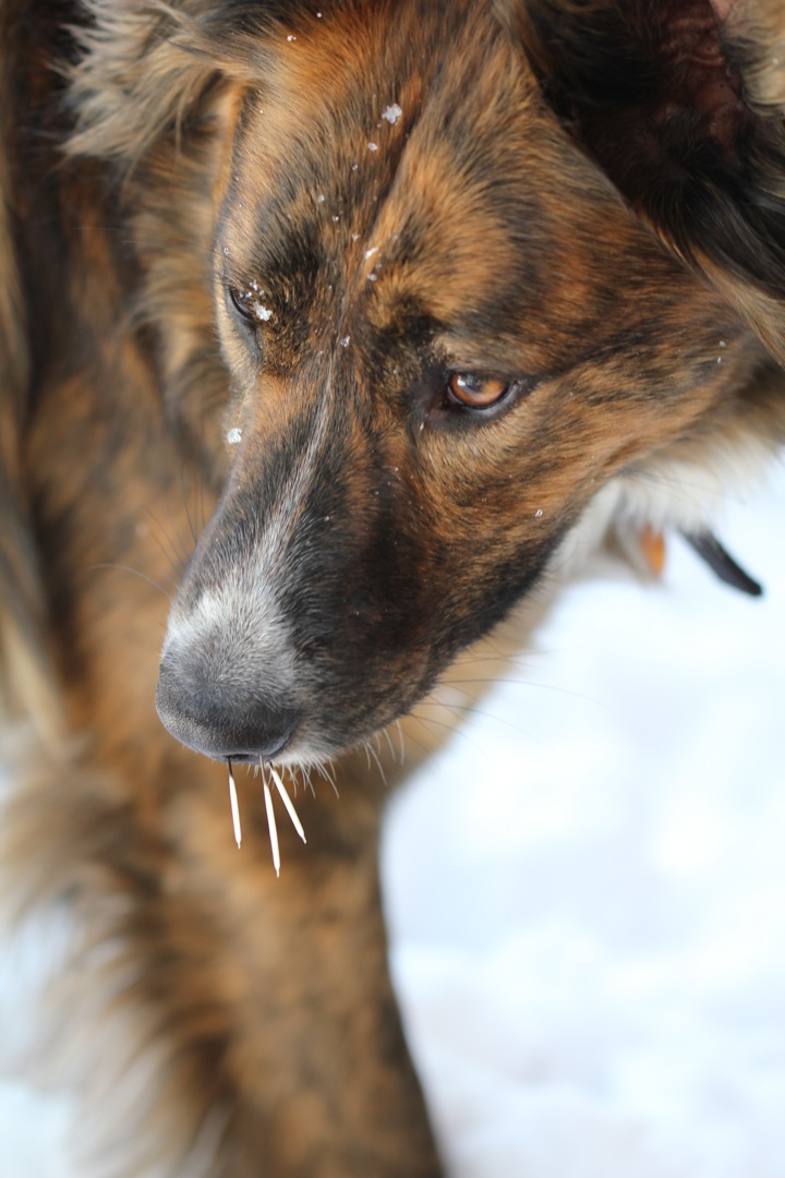 The first time she was quilled she must have barely touched the porcupine as she only had eight quills in total- three in her nose (pictured above) and five in one of her front paws. The quills were not very deeply embedded so I like to believe that she was simply curious, went in for a tentative sniff and then quickly learned her lesson. She avoided the next porcupine we encountered on the side of the road a few months later so I naively assumed that she was safe from porcupine enounters.