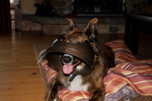 After a while I realized that the cabin had been very quiet and I wondered what Miss Lucy was up to. I glanced over at her cushion in the living room and there she was, lying there like nothing was out of the ordinary… a huge smile on her face… and the bathroom garbage lid stuck to her head! I burst out laughing and ran for the camera. Of course she held the pose until I was finished taking the picture, then she let me carefully remove the lid from her head.