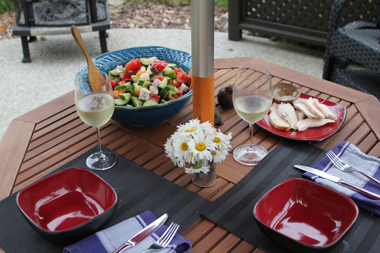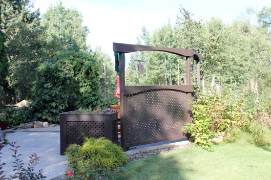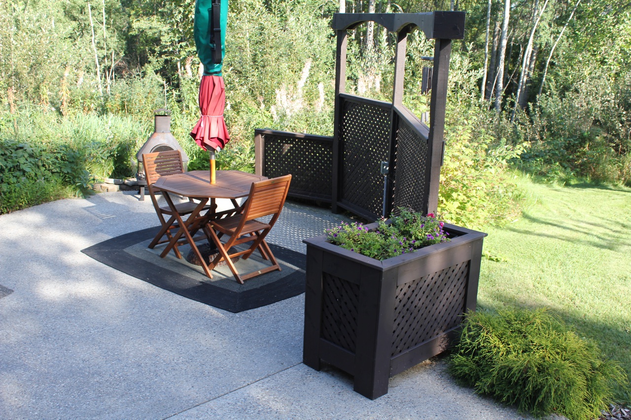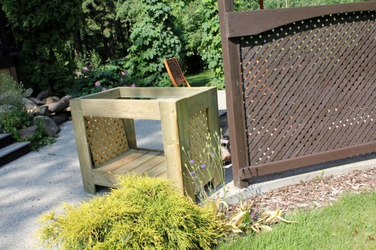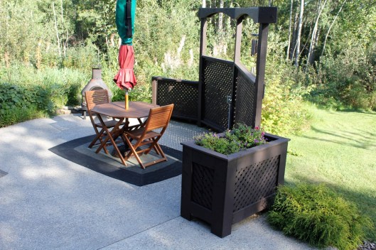 The planter box was built to my specifications. I wanted to be able to put two large plastic pots inside so Brian measured the pots and built this custom planter box to match the trellis beside it. This box also serves as a half-wall which closes in the ‘outdoor room’ quite nicely and adds a bit more privacy when sitting at the table. By this time next year the boxes will be overflowing with flowers and tall ornamental grass, adding even more privacy.
