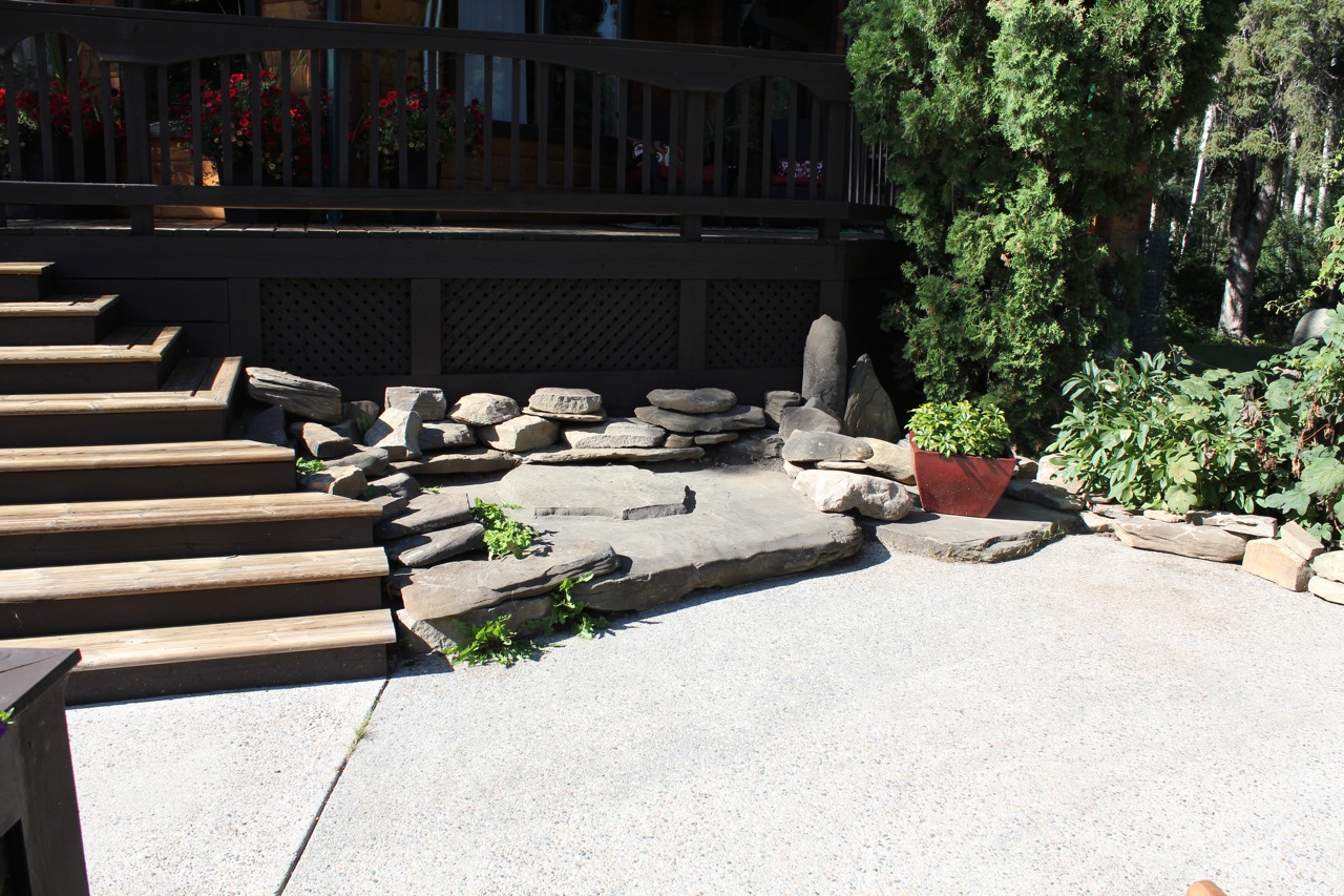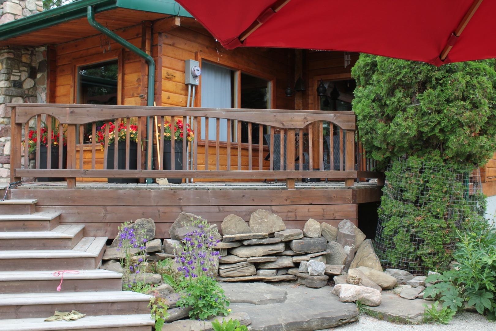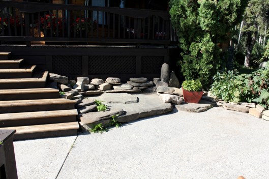 To the left of the patio area is the right side of the front deck and it includes an interesting arrangement of rocks as a focal point. Here is what it used to look like just two months ago (this is what you look at while sitting at the patio table). Notice the old, faded deck stain which gave the cabin a sad, neglected look…