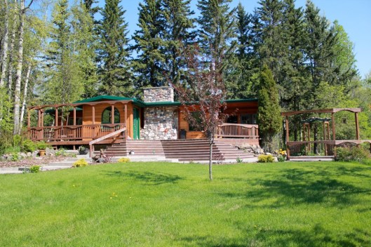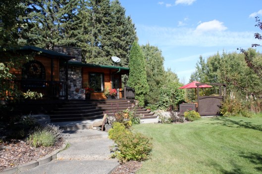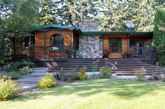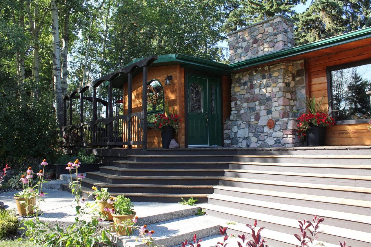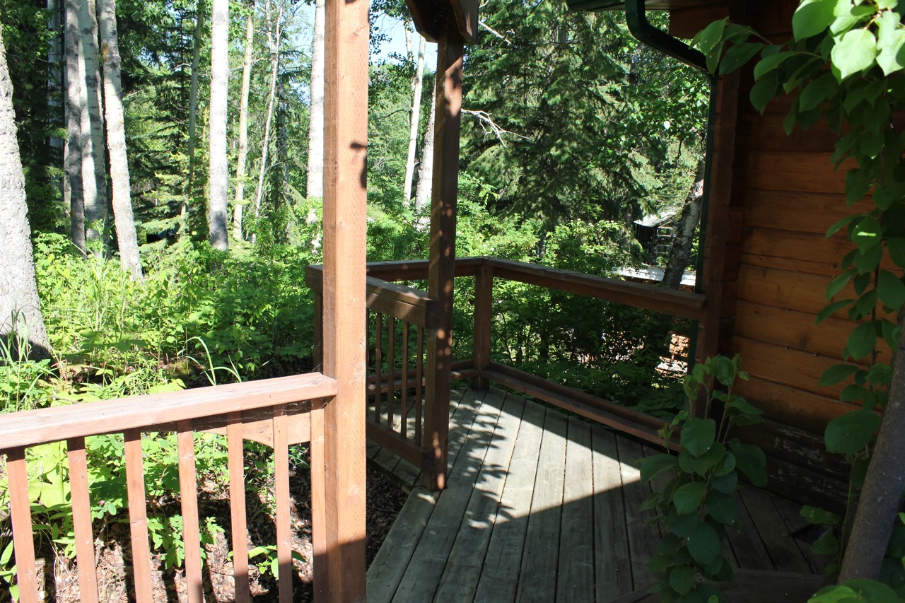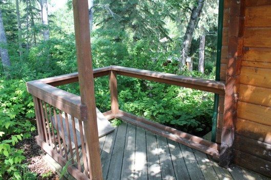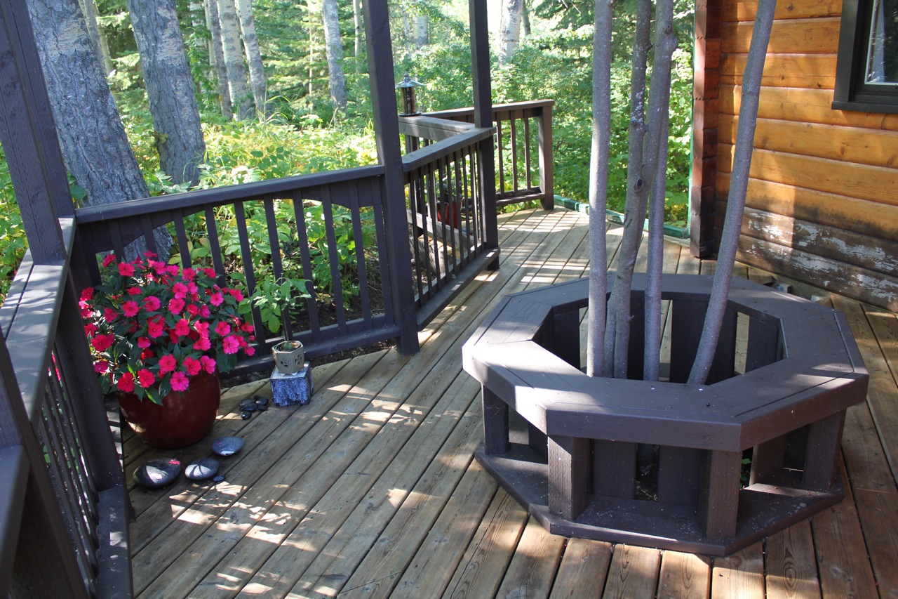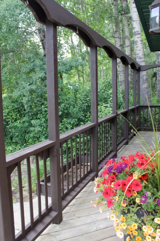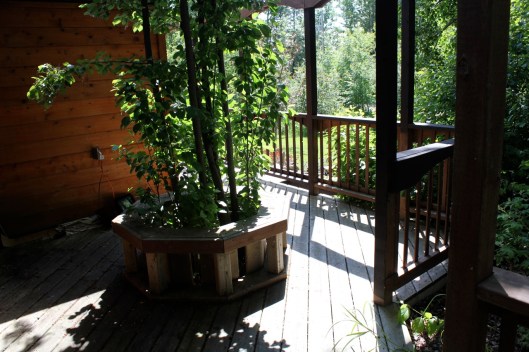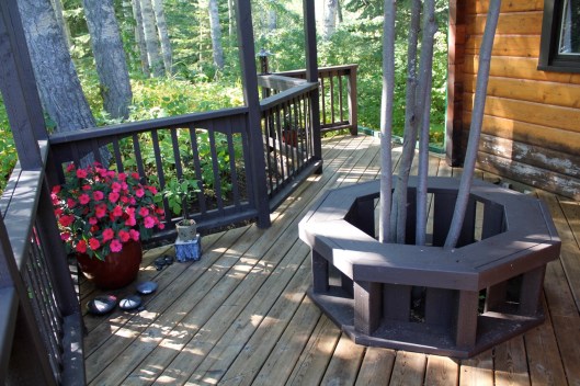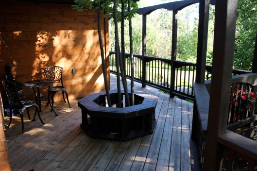 Here is another angle. The dark stain on the deck rails is a really nice contrast to the wood grain of the cabin. Instead of blending in it pops right out and frames the view quite nicely. Next year, I’d like to add a few large bright red clay pots in a variety of sizes to the concrete area for a splash of color.