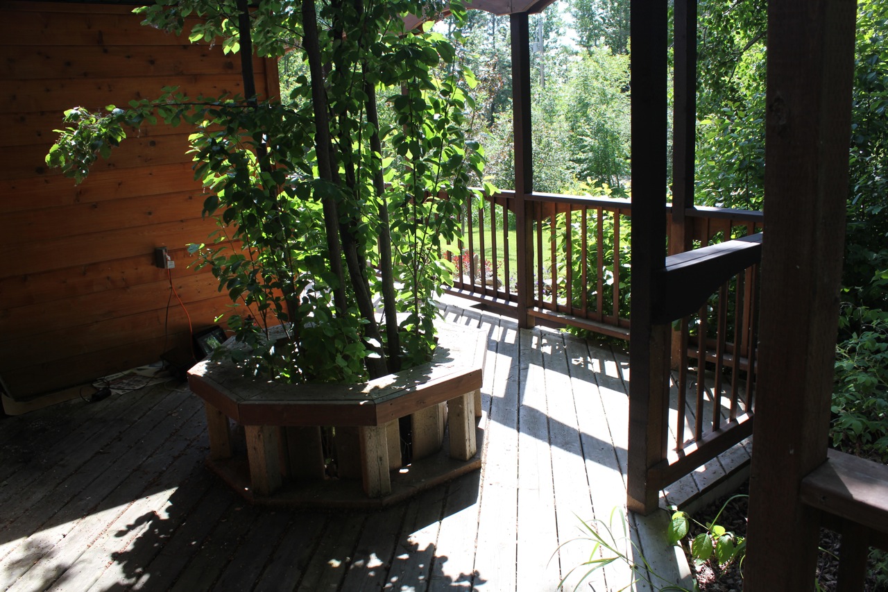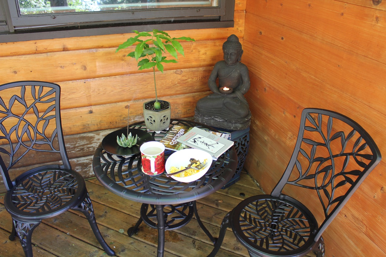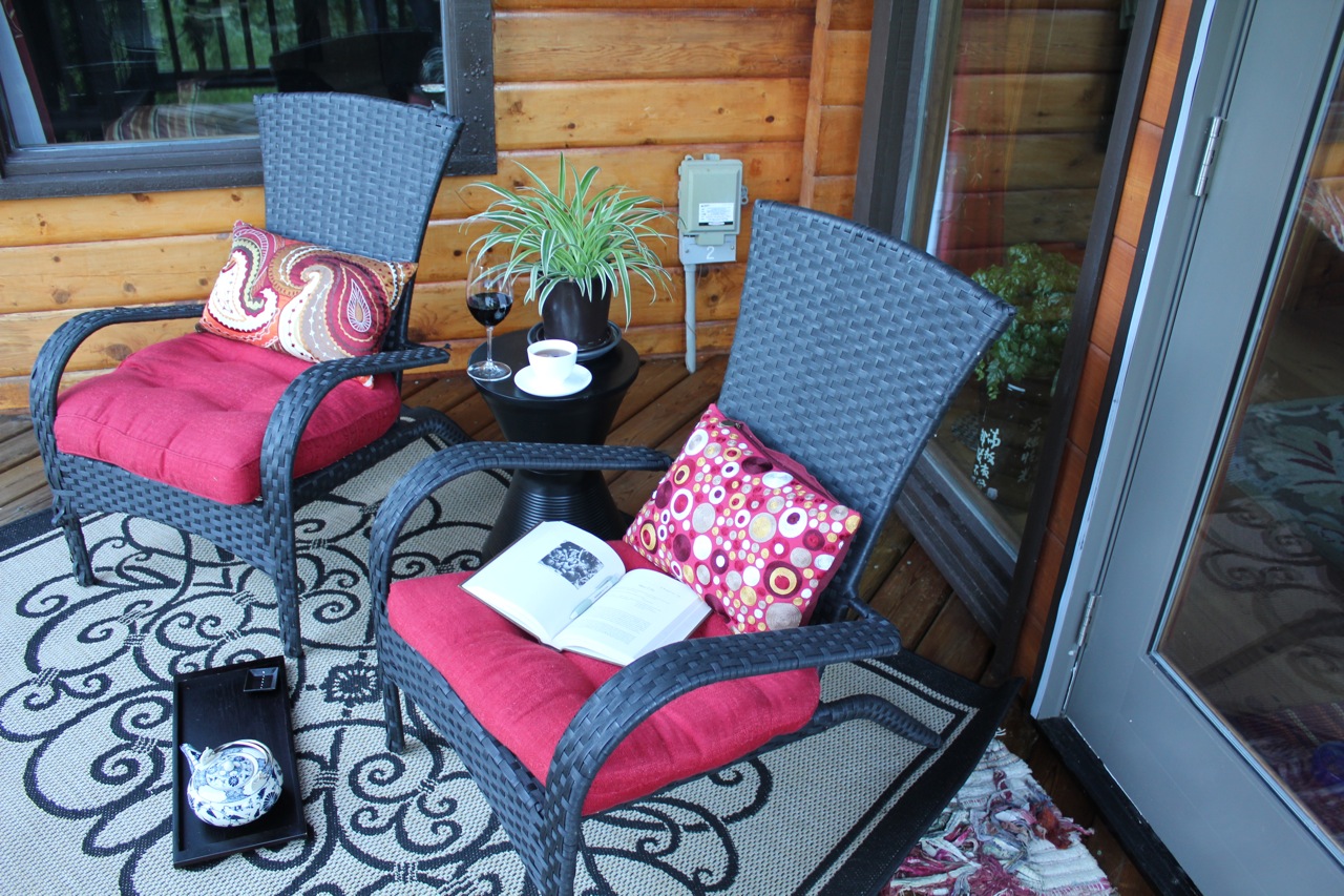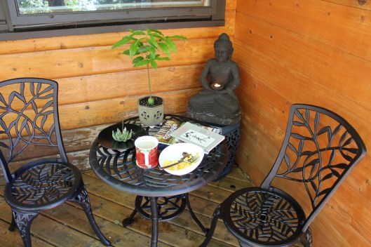 Here is a what the Zen deck looks like now. I have added pots of shade-loving plants and just last week found a square red umbrella at Jysk. I love sitting out here, especially when it’s raining and I can sit under the umbrella and enjoy the peace of the woods.