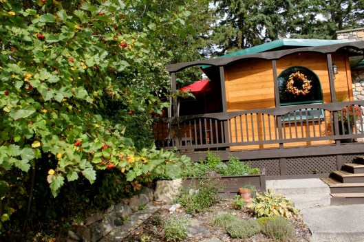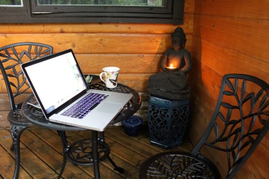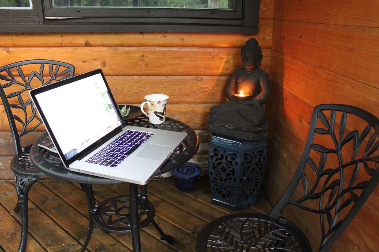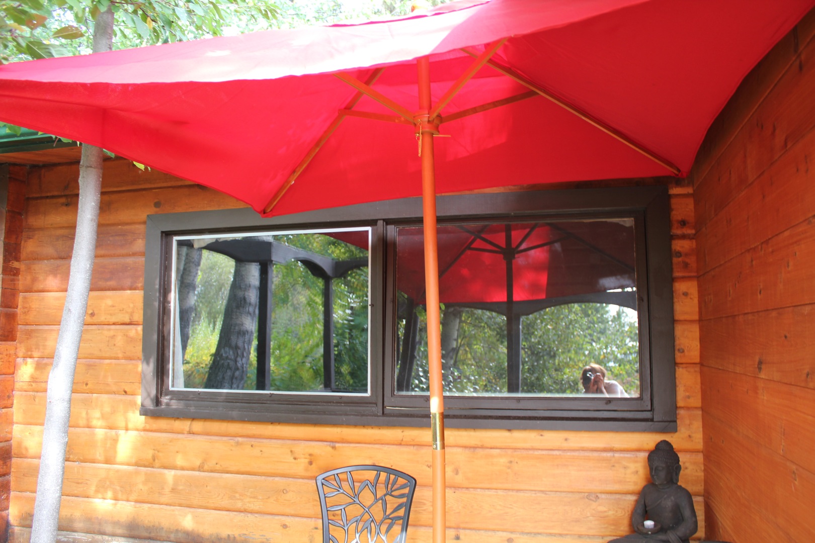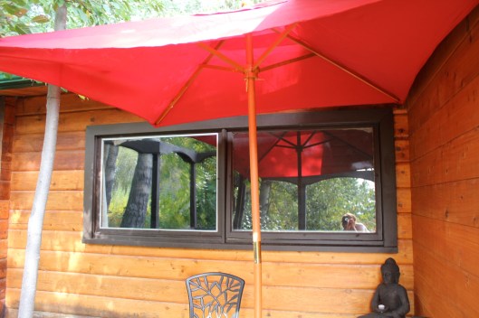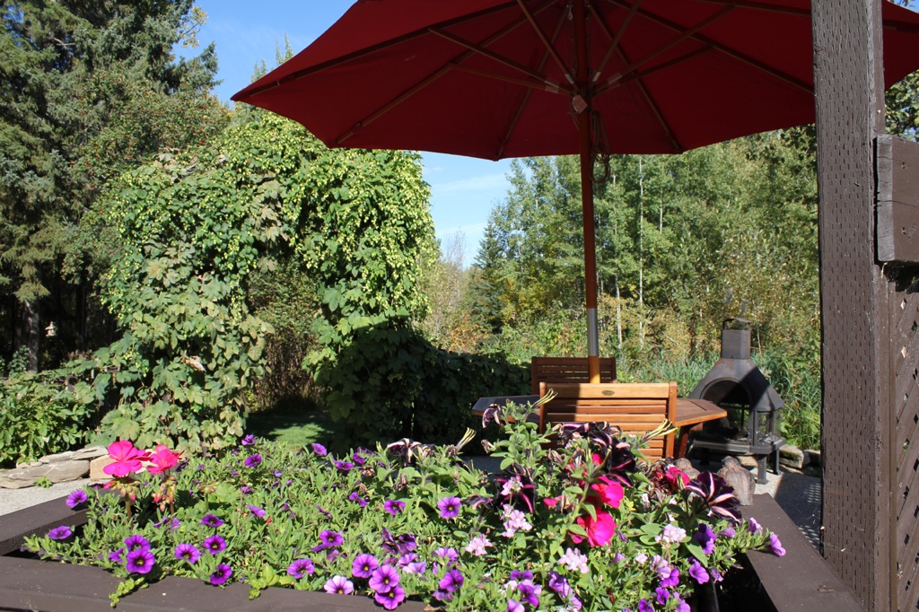 Here is a what the Zen deck looks like now. I have added pots of shade-loving plants and just last week found a square red umbrella at Jysk. I love sitting out here, especially when it’s raining and I can sit under the umbrella and enjoy the peace of the woods.