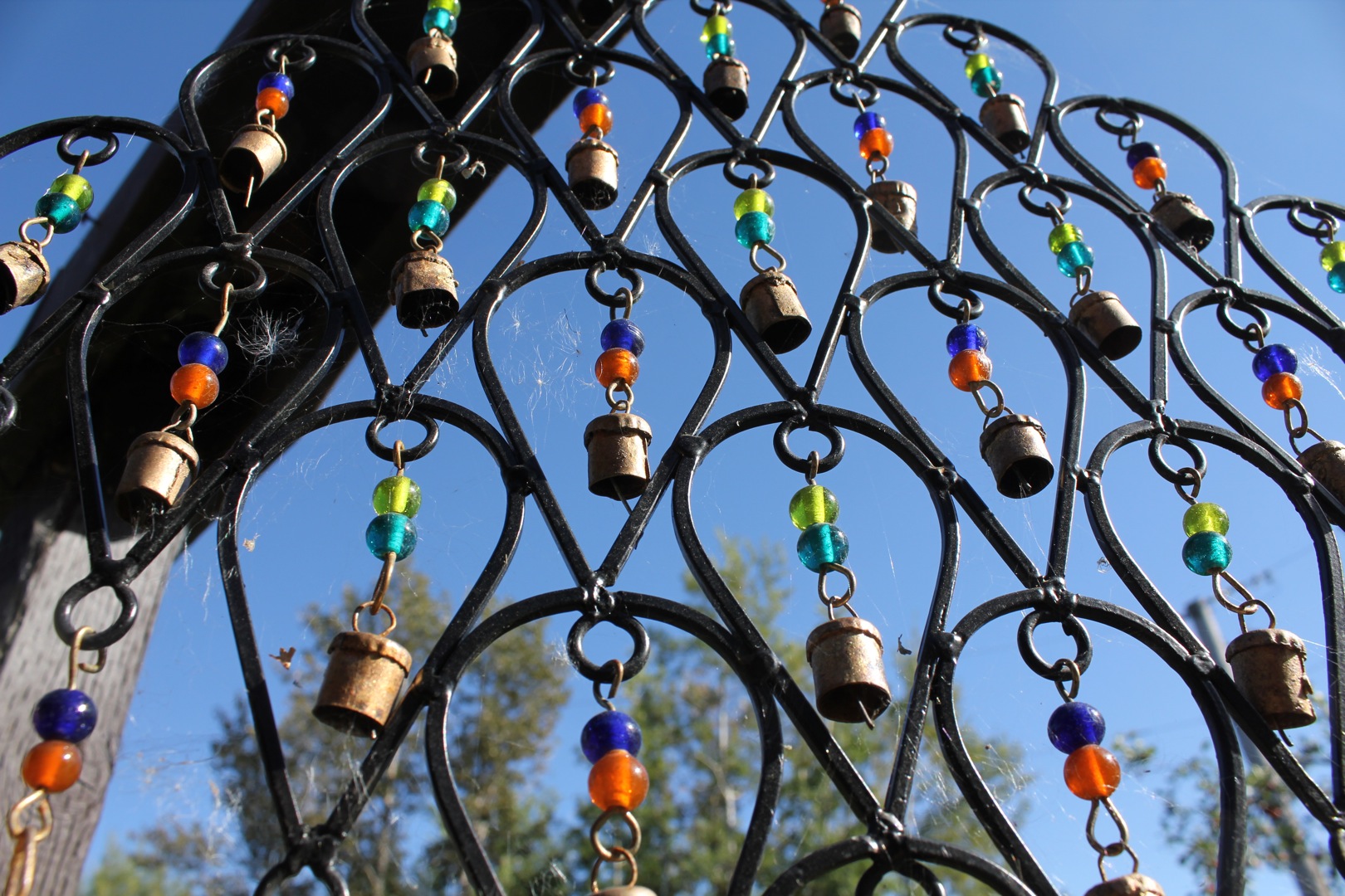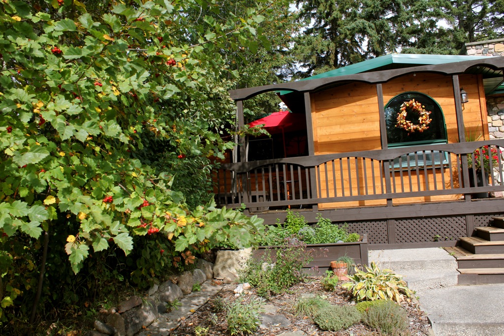 This is a very hidden, private and quiet part of the deck, surrounded by trees and in deep shade. I decided to make this a ‘Zen deck’- a place for peaceful retreat, for quiet work, or simply a place to reflect and contemplate. I found the perfect cast iron bistro set (at Canadian Tire) that has a bamboo pattern. I found the Buddha at Polly Maggo’s on Whyte Avenue in Edmonton. It is actually a water fountain and I will set it up once I find the right bowl for him to sit on. The blue ceramic garden stool that the Buddha is sitting on was purchased at Pier1 Imports.