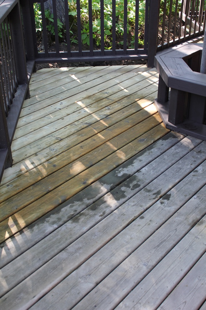 I also scrubbed (and scrubbed and scrubbed) the entire deck floor by hand with the stiffest scouring brushes and pads I could find. The deck looked quite black, but when it was wet it was actually green… Moss? Algae? I scrubbed it until I could see the original wood again and then sealed it with a clear sealant. The deck floor is so much easier to sweep and keep clean, and it is quite satisfying to see the water bead up on the deck floor now whenever it rains instead of being soaked up by the wood.