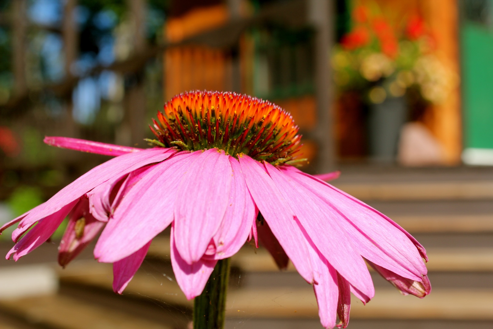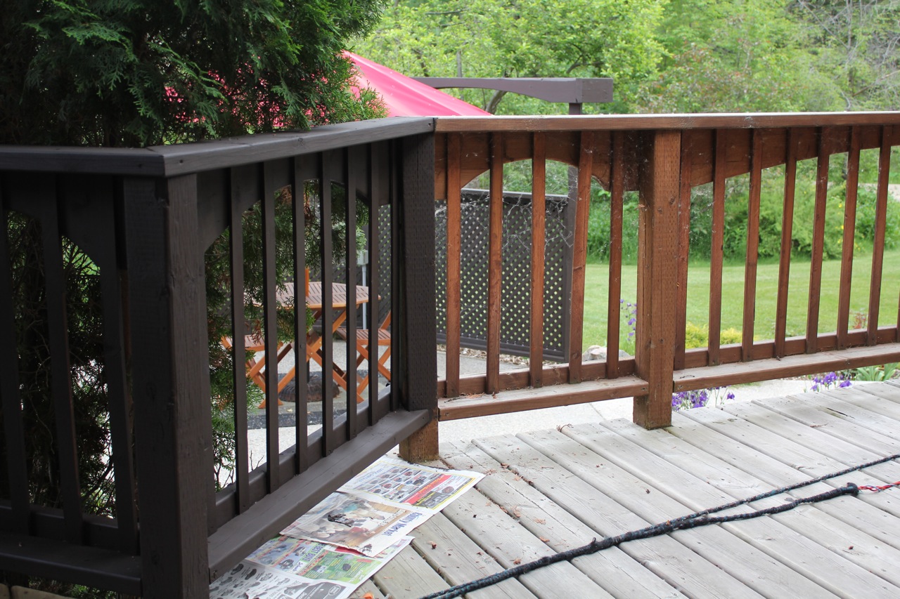 While B got to work fixing the railing, I began staining the front deck rails just above the herb and tea garden (and planter) which lead to this part of the deck.