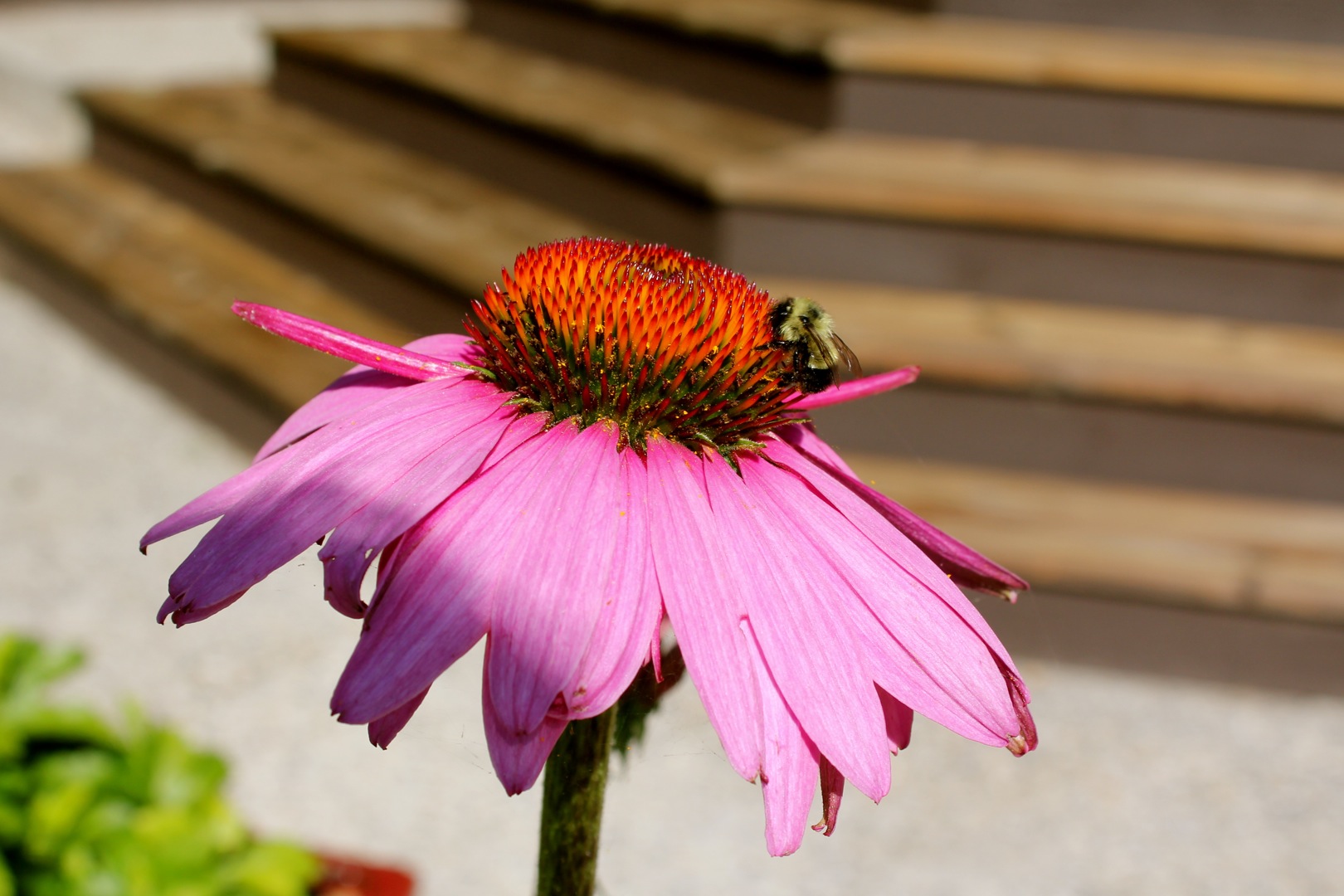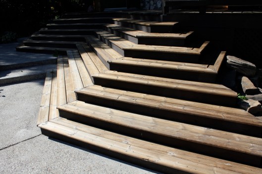 Next, B removed the railing at the ‘look out’ and built three wooden stairs that connect with the stone stairs leading down to the back door.