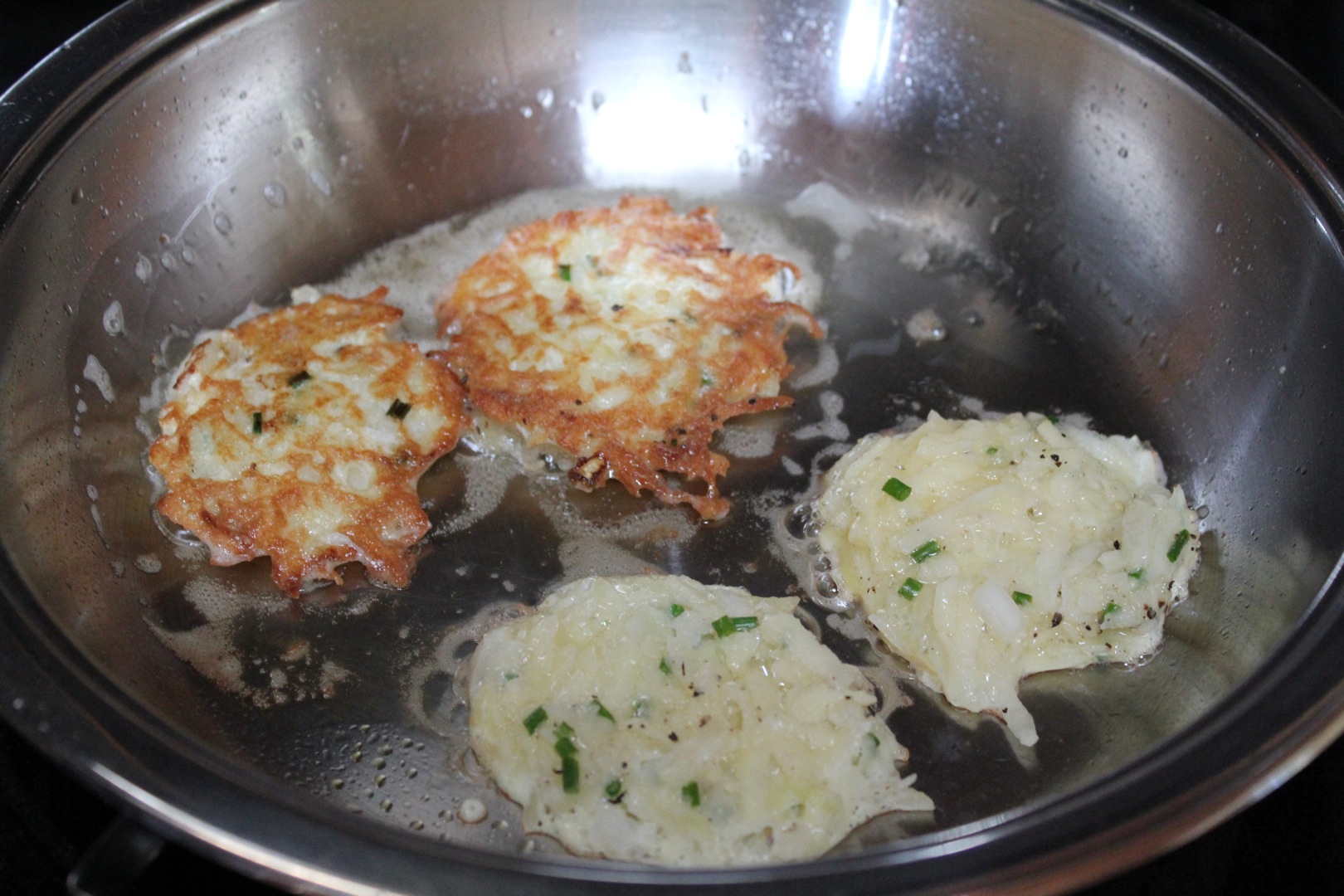 In a heavy-bottomed frying pan, heat about 4 tablespoons of oil until hot. Drop one heaping tablespoon of the mixture into the pan and flatten with spoon. Continue until the pan is full of latkes. Cook until golden brown and then flip over and cook other side until it is also golden brown. Continue with the rest of the potato mixture, adding more oil to the pan as needed. Transfer latkes to a warm baking sheet and keep warm in a 200 degree oven until ready to serve.