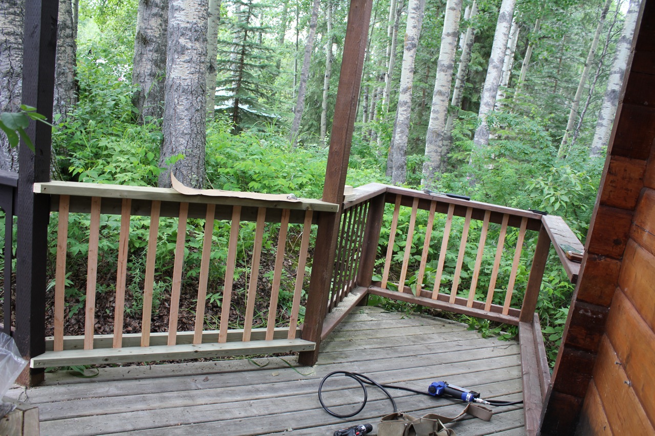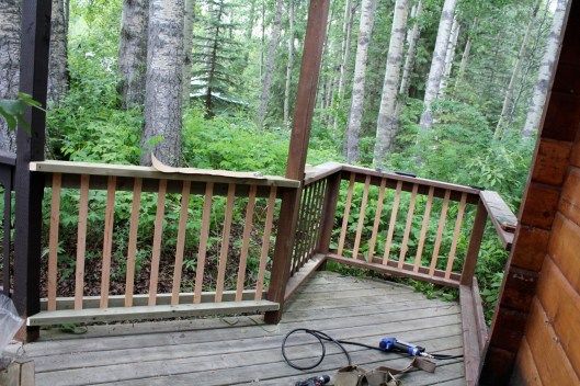 B closed up the opening with new railing and added the missing slats while I followed him with my can of stain…