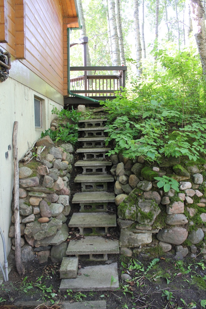 Note: We will be moving the eavestrough so that it runs below the stairs but this will also involve digging a small trench so that we can extend the pipe about six feet to where the ground slopes away from the cabin.
