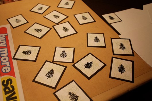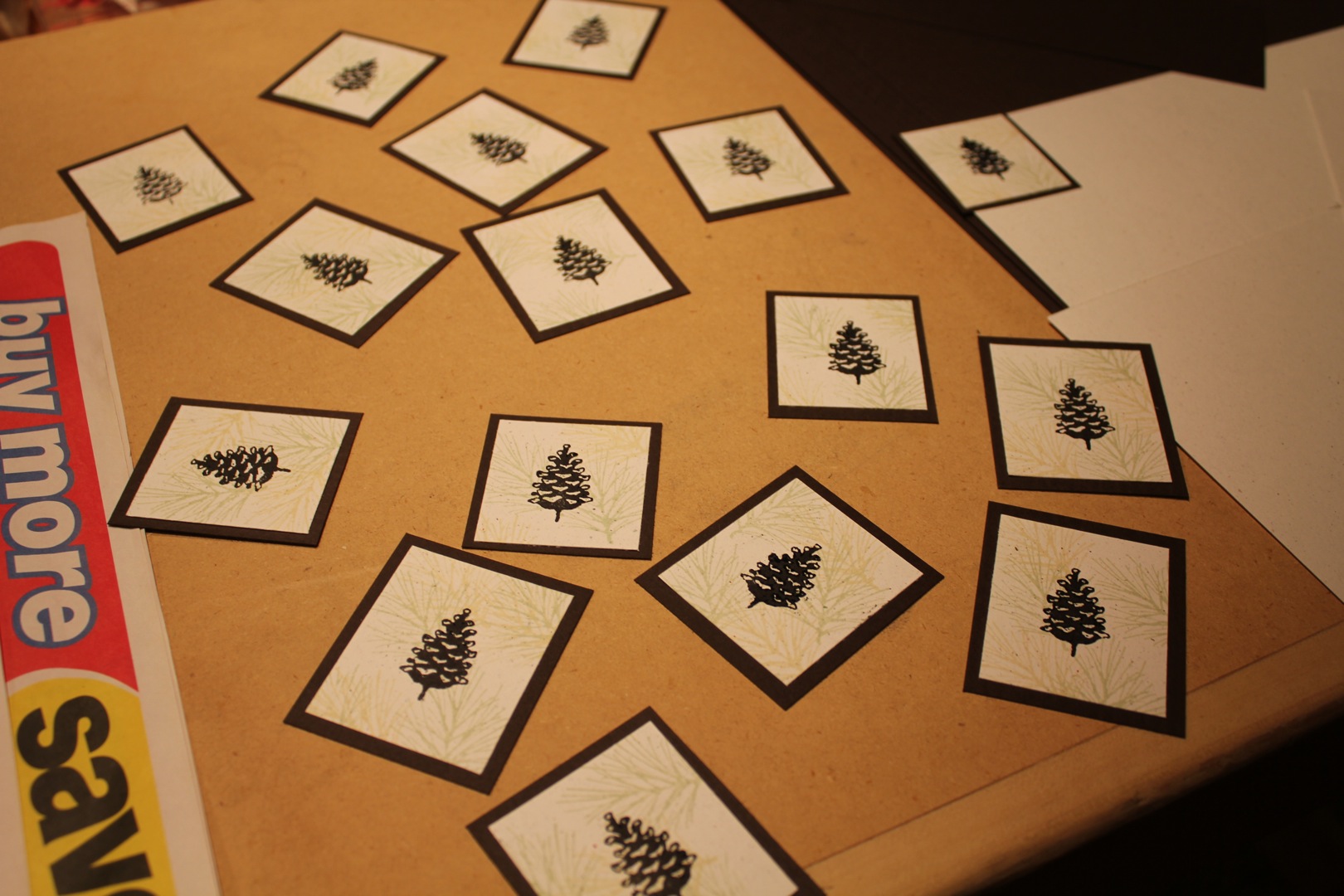 Meanwhile, I was making a small batch of cards for myself. I began by cutting out little squares of white card stock, then stamped a pine cone in dark brown ink over a background of pine needles stamped in a lighter green ink. (Note: these stamps are from the Definately Decorative Pines set from Stampin’ Up.) I adhered each of the white squares onto a slightly larger deep brown square using double-sided tape.