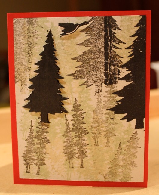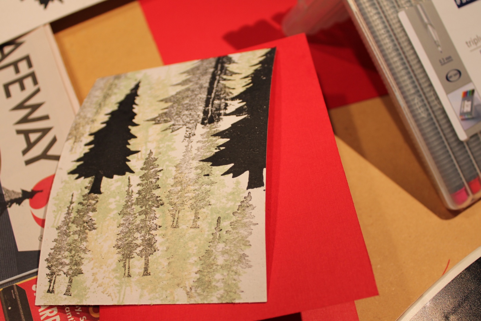 E decided to do a forest theme for the front of her card. She used different sizes of tree stamps as well as different colors of ink layered on top of each other to give the effect of trees in a forest.