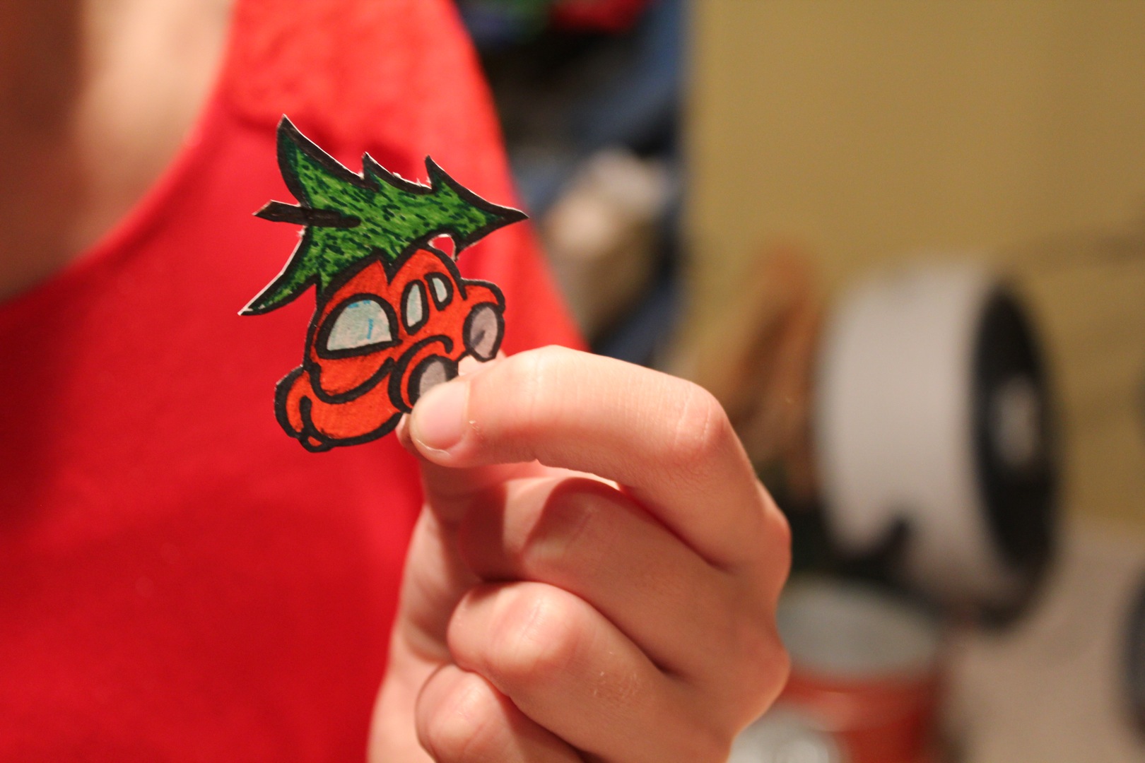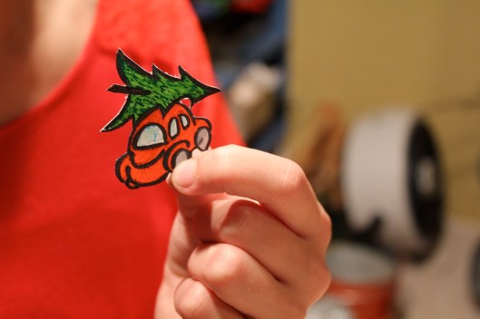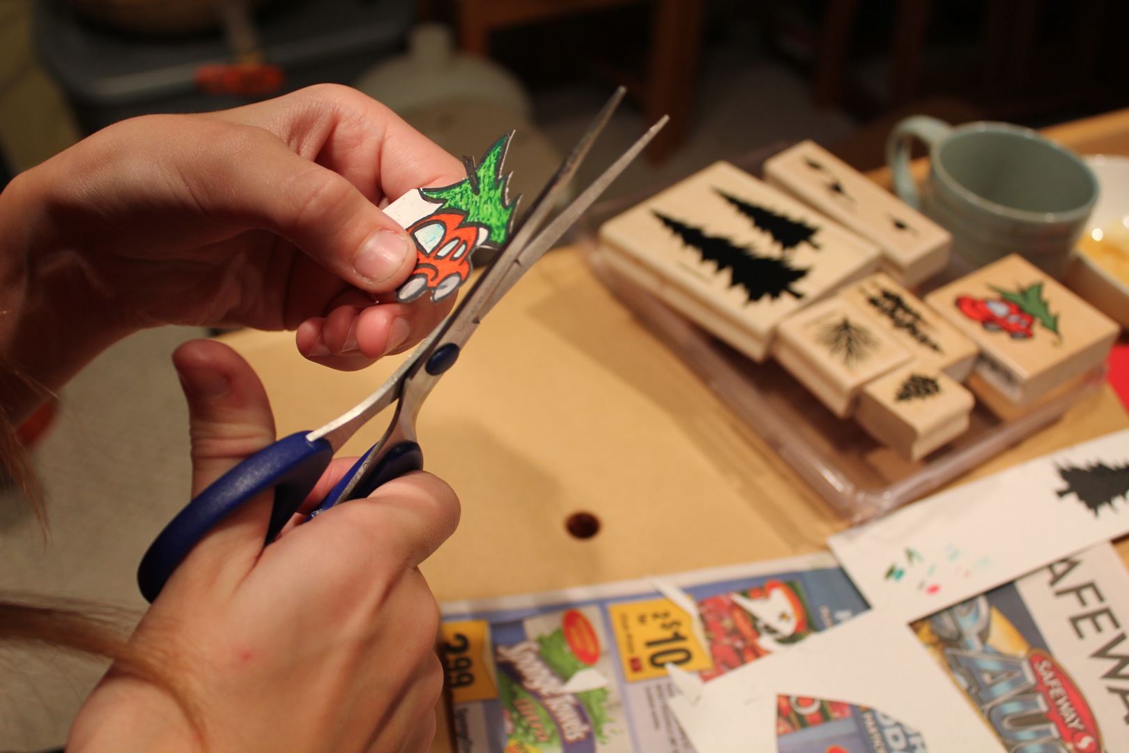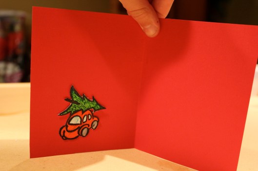 To follow the tree theme, she cut out this cute little stamp of a car carrying a Christmas tree home, which she had colored in with markers. Below is the front of the finished card.