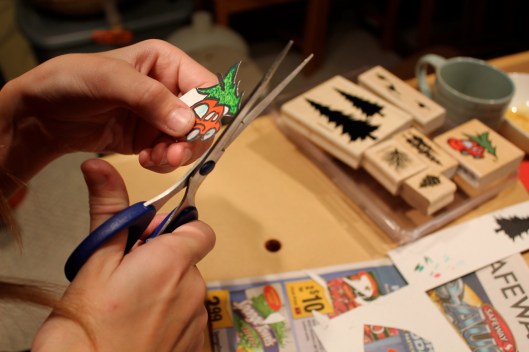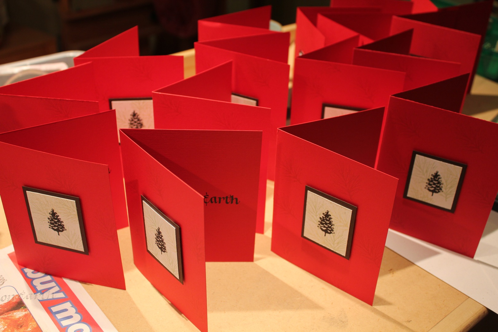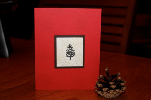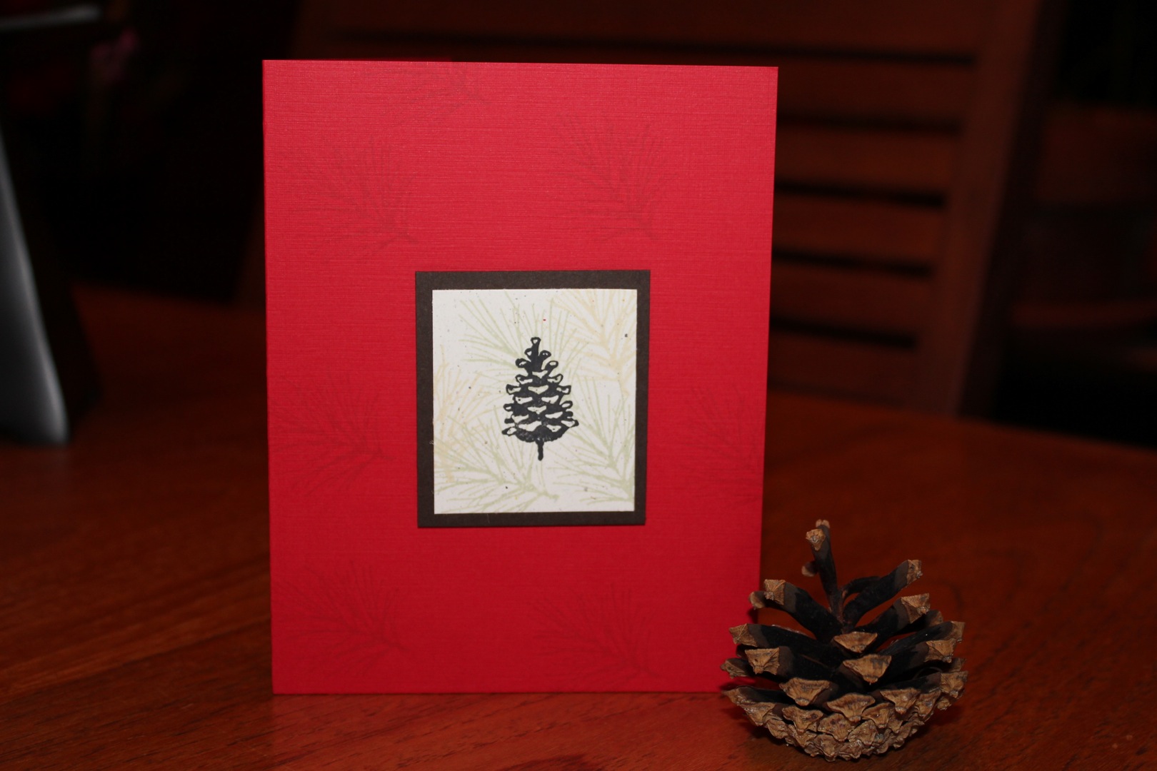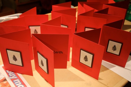 Next, I prepared the red card stock by cutting each 8-1/2″ x 11″ piece in half, then scoring each of these in half and folding them. I stamped “Peace on Earth” on the inside and let this dry a little. Then I stamped the pine needles in green ink over the front and adhered the pine cone squares with thick mounting tape.