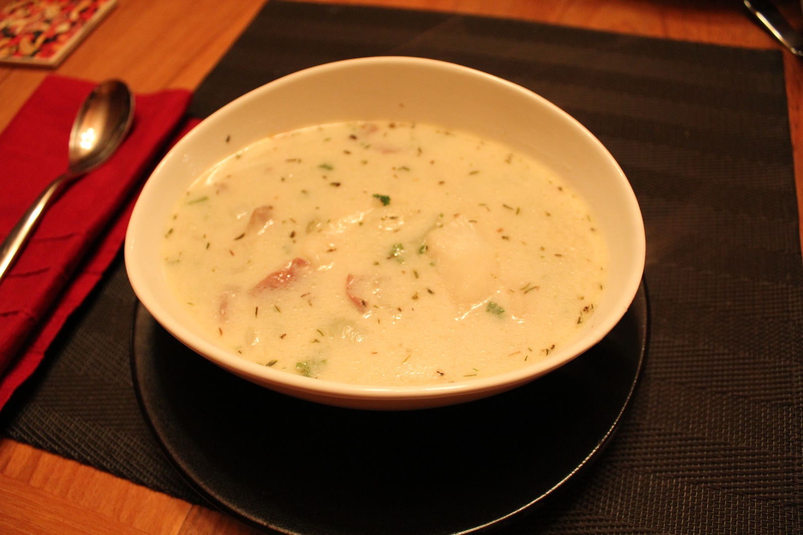 cod, cod chowder, fish, fish chowder, mussels, potato, saffron, soup