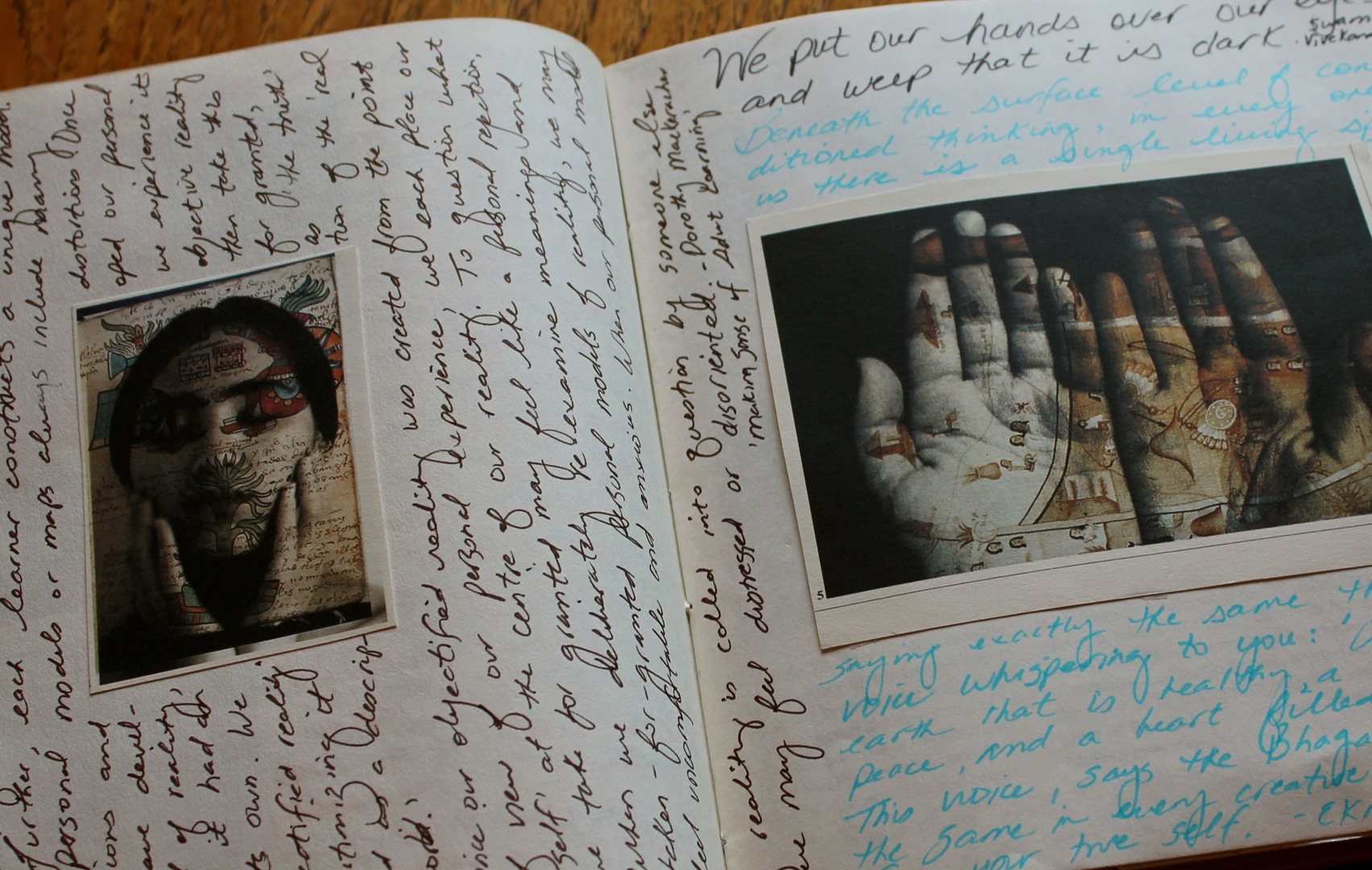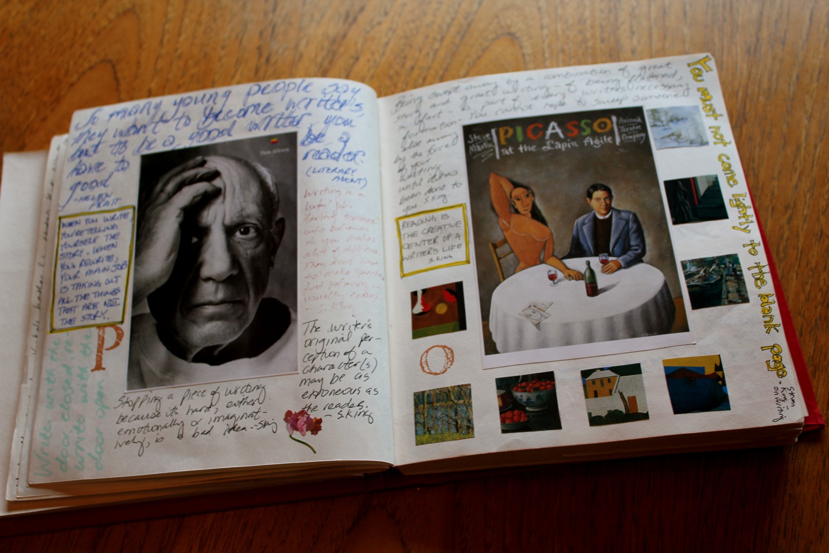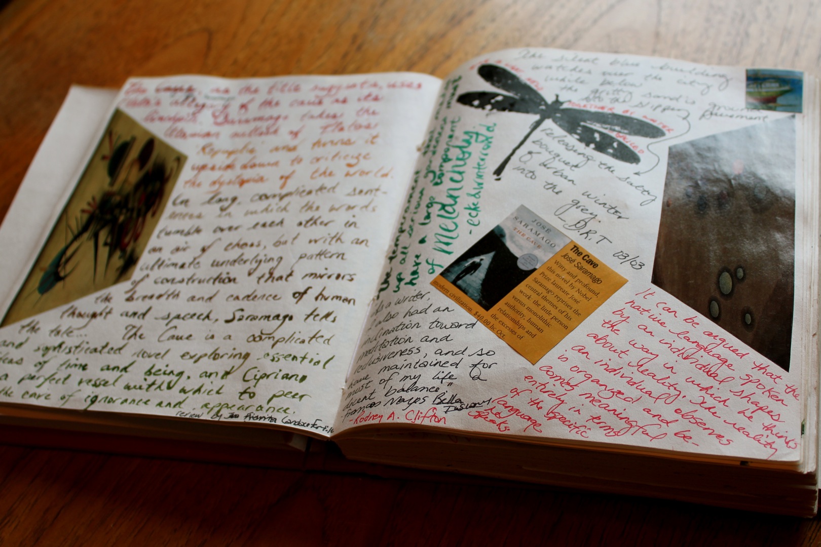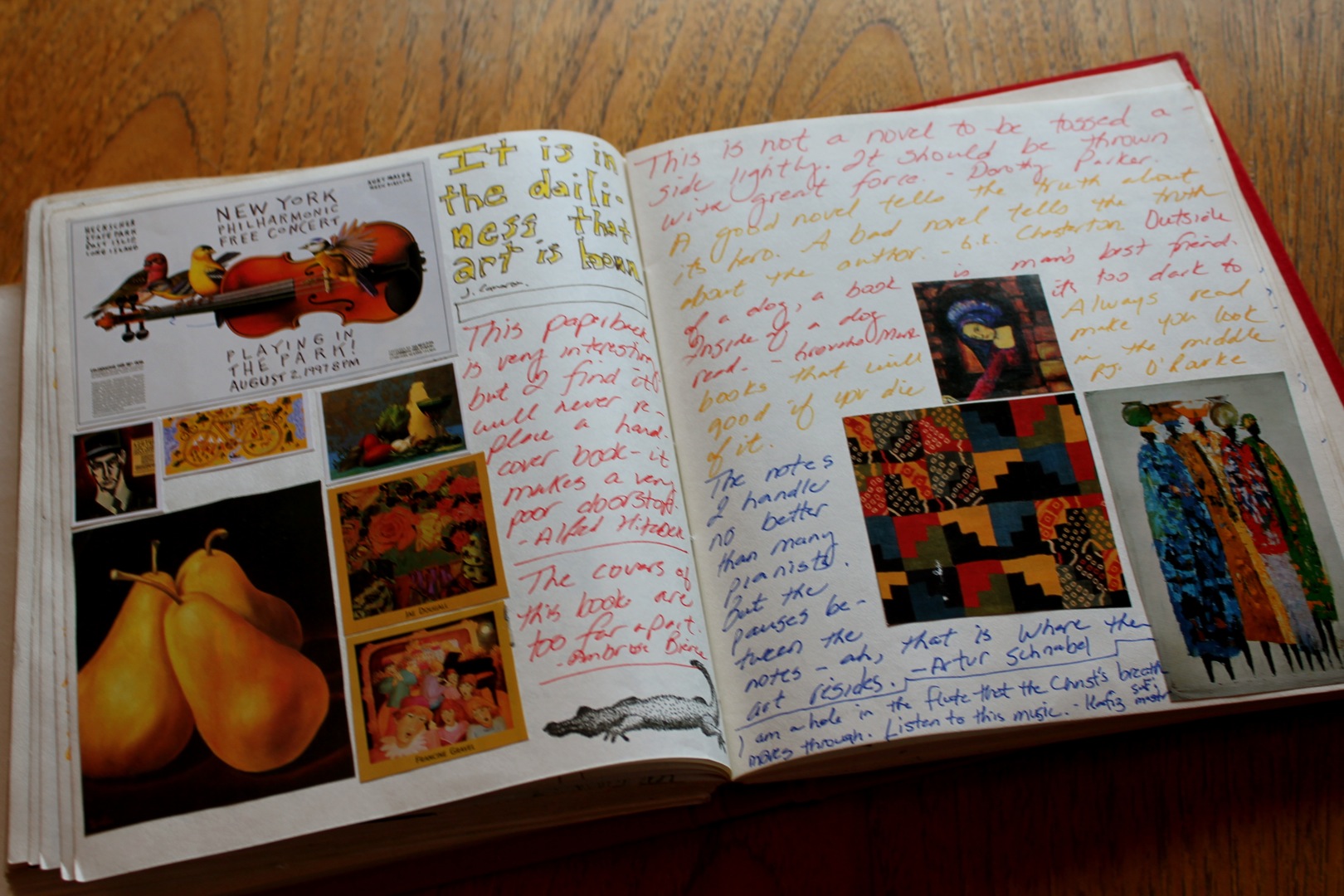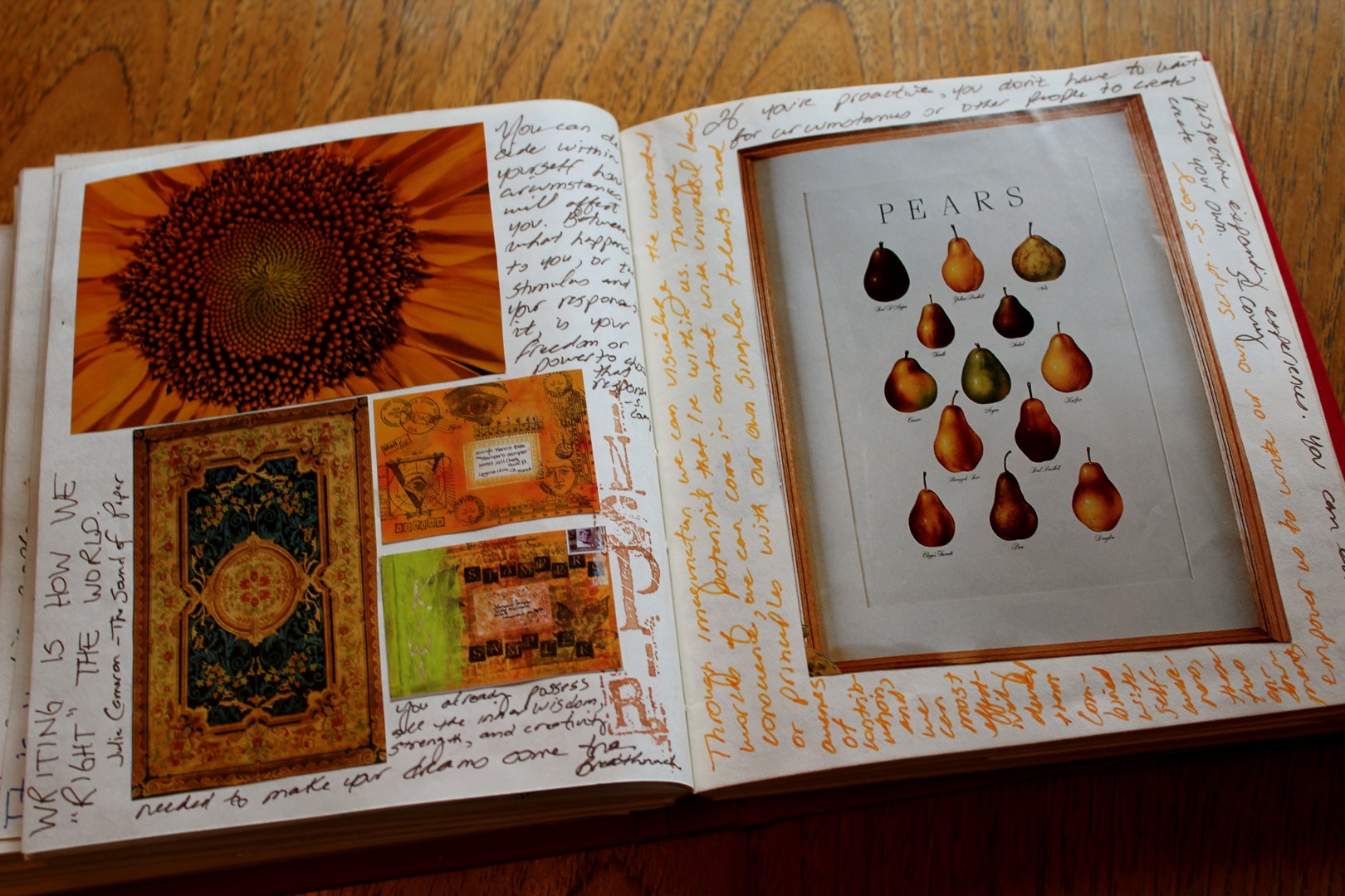 DSC01276I spread out all of the pictures and grouped them intuitively, not by theme or content, but by color and texture. (This was about eight years ago.) Then I took each grouping and arranged them in my journal, using double-sided tape to hold them in place. There was still some blank spaces on each page and I decided that I would use the space to record some of my favorite quotes. I normally underline favorite passages in the books I read but every once in a while I would come across an incredibly juicy, startling or brilliant phrase that I just had to record somewhere safe so that I would never lose it.