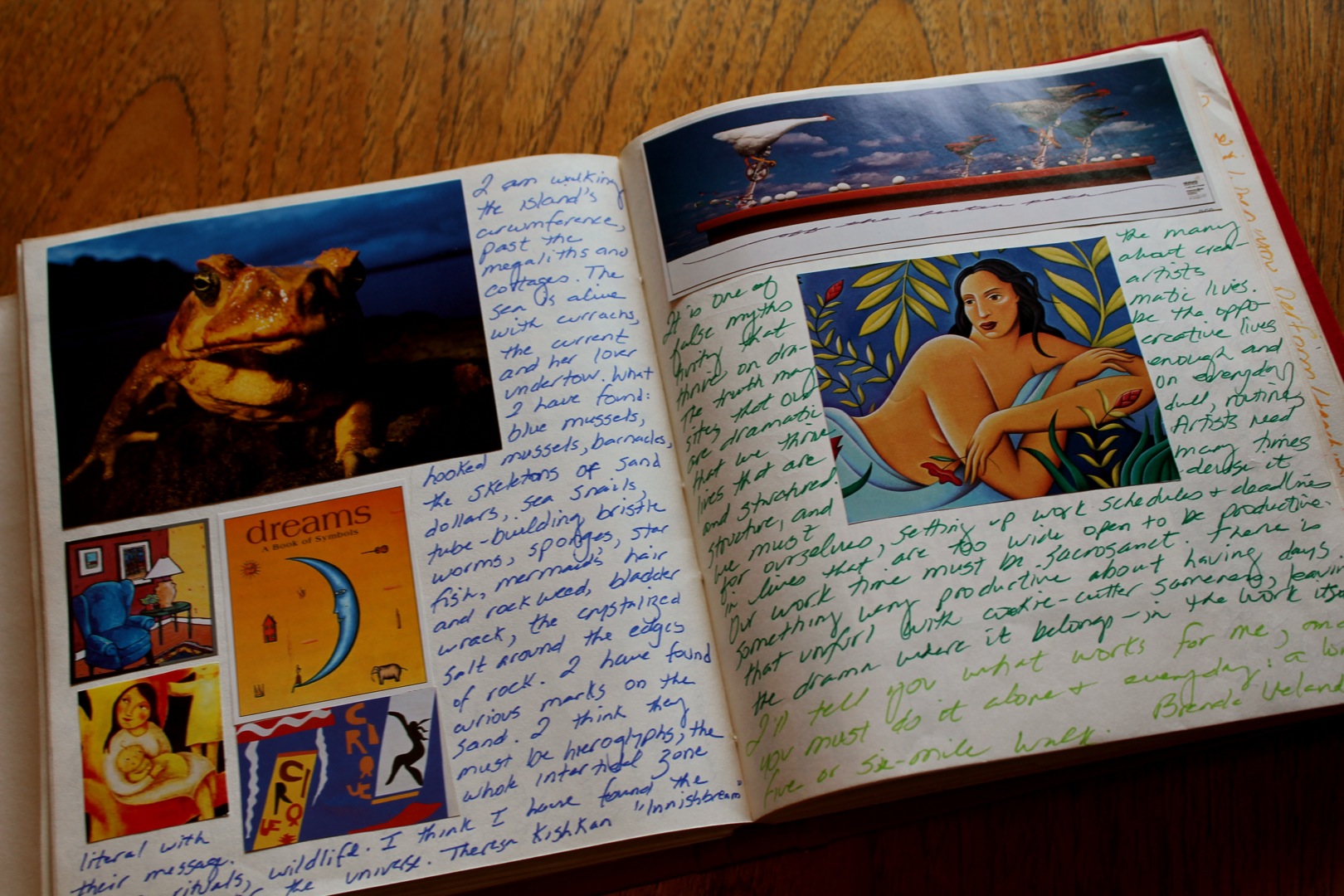 I used to pack this journal along with me on trips and I would read it, cover to cover, like a novel. Now, the binding is getting old and the cover quite frayed, so I keep in it a drawer next to my bed and sometimes enjoy the last quiet moments of my evening enjoying the creativity journal. Many ideas for projects have come out of this ongoing process…