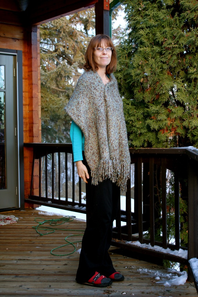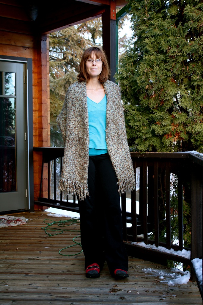 Or I can wear it without the pin and allow the stole to fall open. This is casual ‘at home’ look. I’ve also been wearing this stole to work with a dark brown skirt and turtleneck, knee high black-brown boots and silver jewelry.