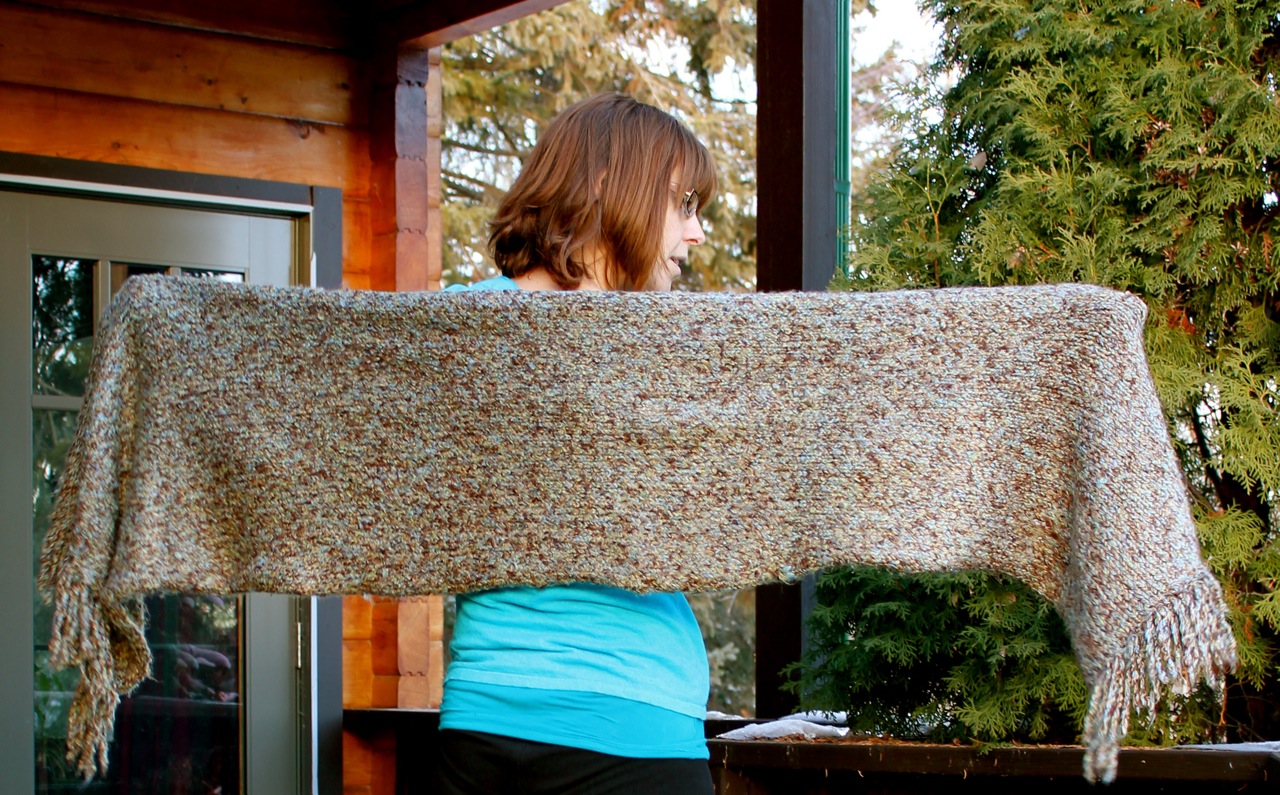 This was a great ‘third’ project (after two smaller scarves). It allowed me to practice simple stitches while working on my tension and getting comfortable with the needles. After casting on, there was no counting involved so I was able to chat or listen to lectures and podcasts while happily knitting away.