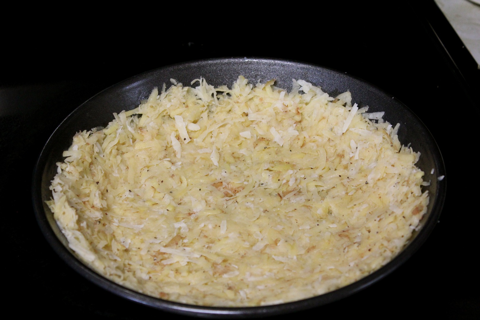 Press the mixture in an even layer into the bottom and up the sides of the greased 10-inch pie plate. Bake in preheated oven for 20 minutes or until the potatoes begin to brown. Remove from oven and let sit for 5 minutes before adding the quiche mixture.