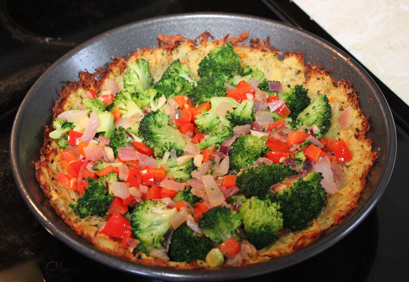 In a large mixing bowl, whisk together the eggs, milk, cheese, salt and pepper. Spread the vegetables in the potato crust.