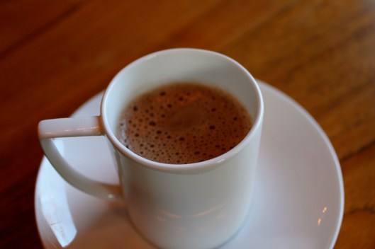 By the way, when it came time to clean my chocolate bowl, I heated up some almond milk and added it to the bowl and whisked the last of the chocolate into the milk. Voila! Hot chocolate! I poured this into two tiny cups, sprinkled a bit of cayenne pepper on top and served this to B. A delicious and healthy treat!