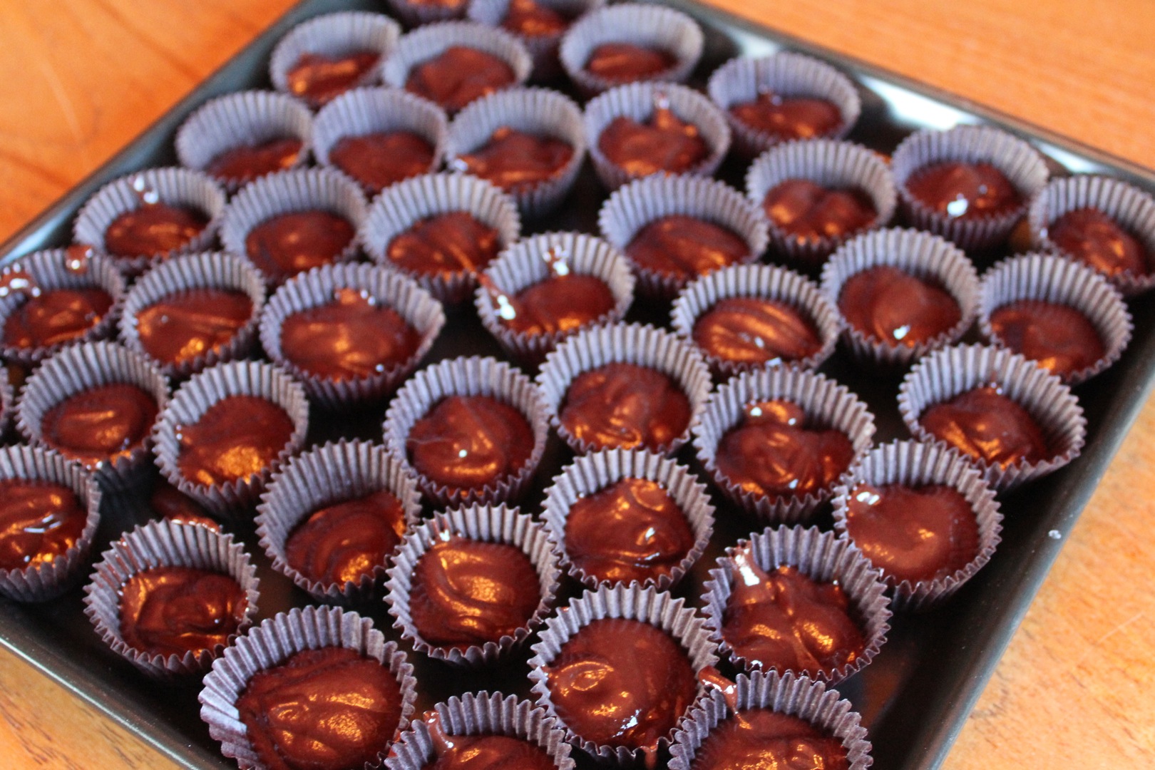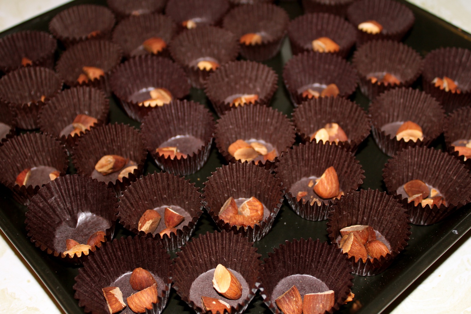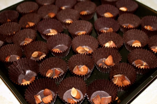 Toast almonds and set aside to cool. Distribute tiny cupcake paper cups (I buy these at craft stores in the candy-making section) on a plate, or lay out candy molds. Put a few pieces of nuts into each cup.