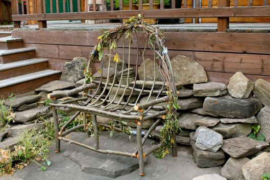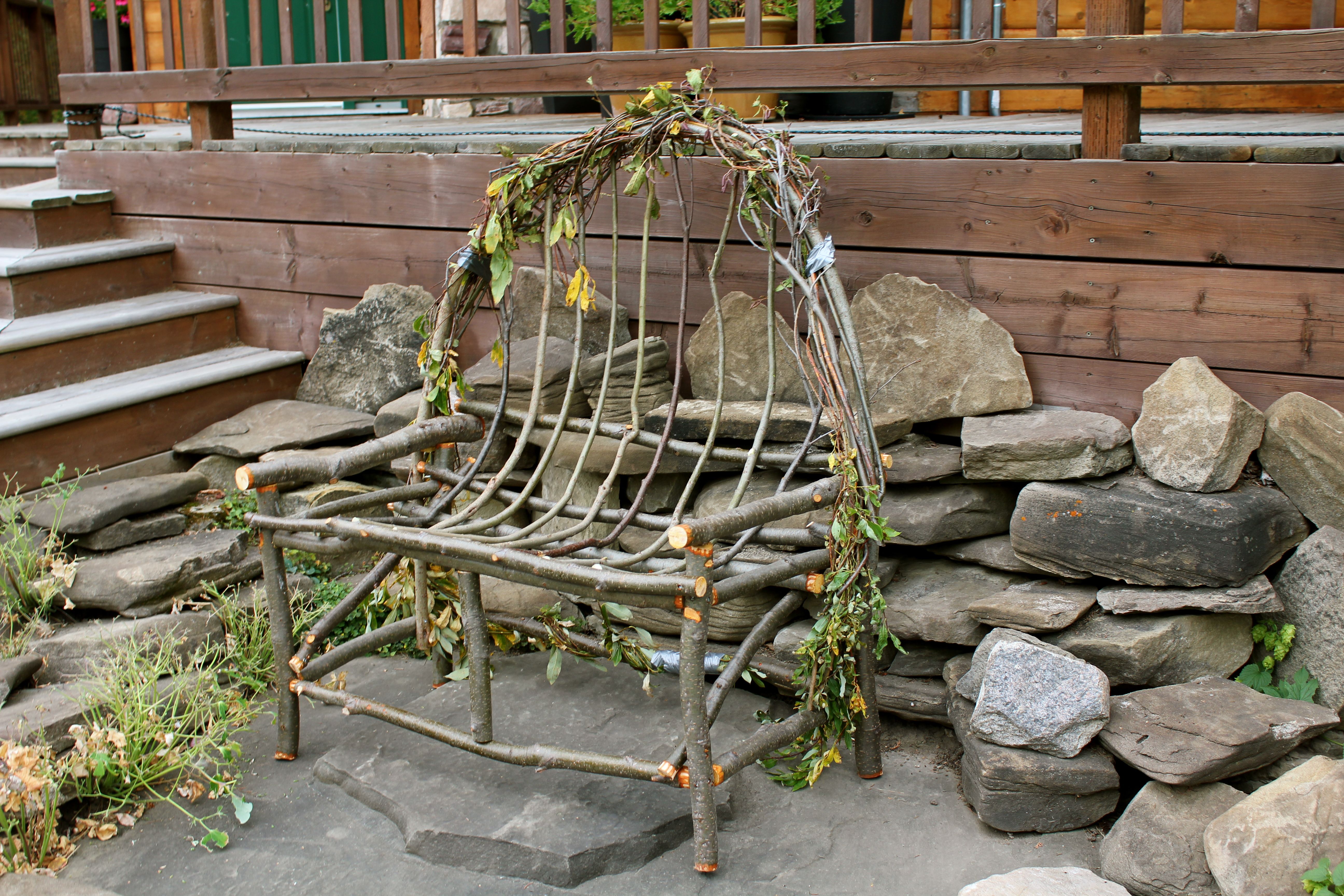 Then we trimmed the upper branches and twisted the smaller branches around the larger pieces. Here is my ‘finished’ settee. The duct tape will stay on until the wood has dried and ‘cured’. At that time I will also do a final trimming of any loose branches and remove the dead leaves. I will also look for some fabric to sew a custom cushion for the seat.