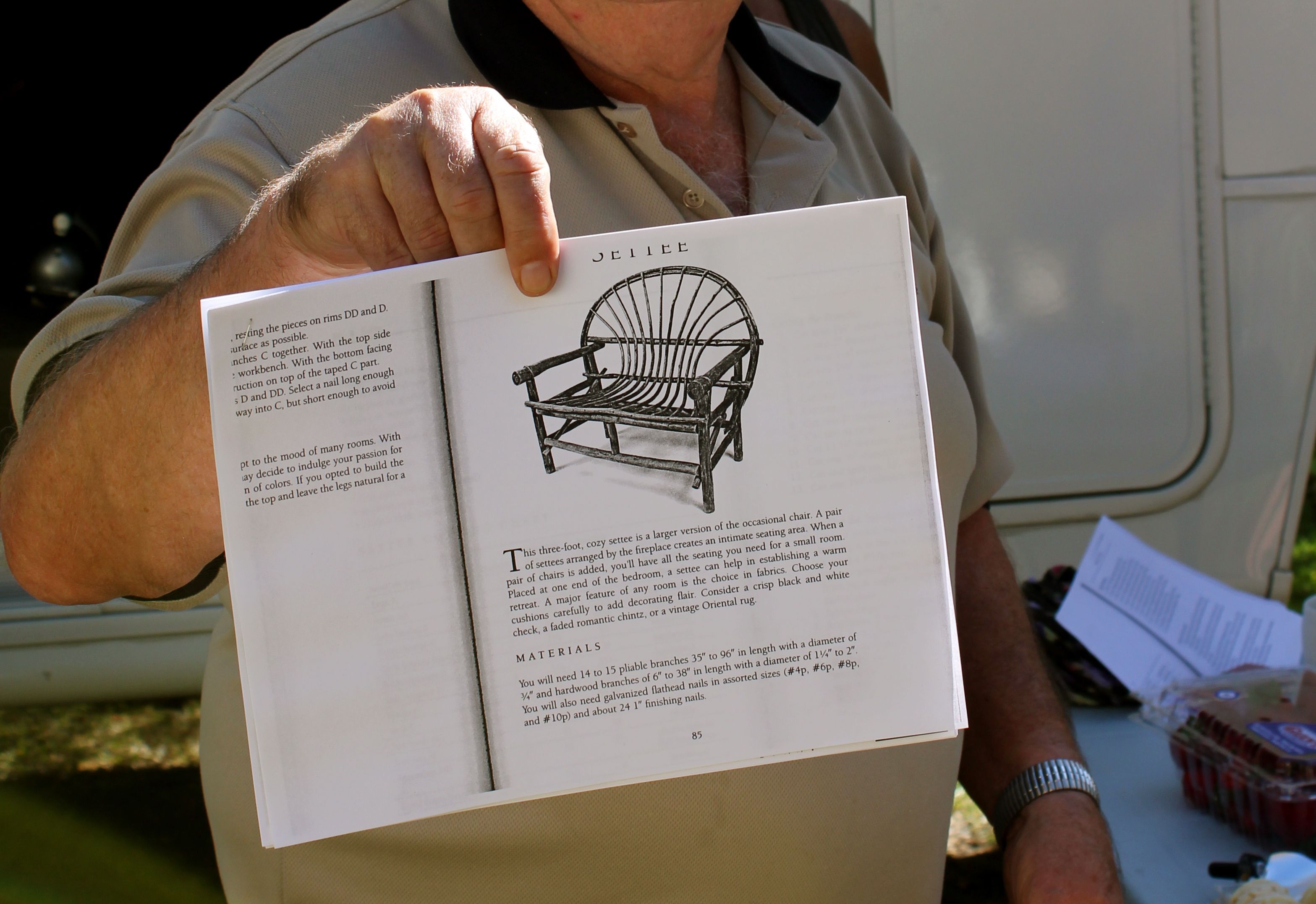 This weekend I had the privilege of spending an afternoon with my friends/neighbors, Kathy and Wayne. They had family visiting and had planned to build bent willow settees together. I had always wanted to learn to work with willow and jumped at the chance to join them. We were all lucky that Kathy had done this before and was going to lead everyone (with Wayne’s help) through the process. Here is Wayne (“foreman”), ready with the instructions…