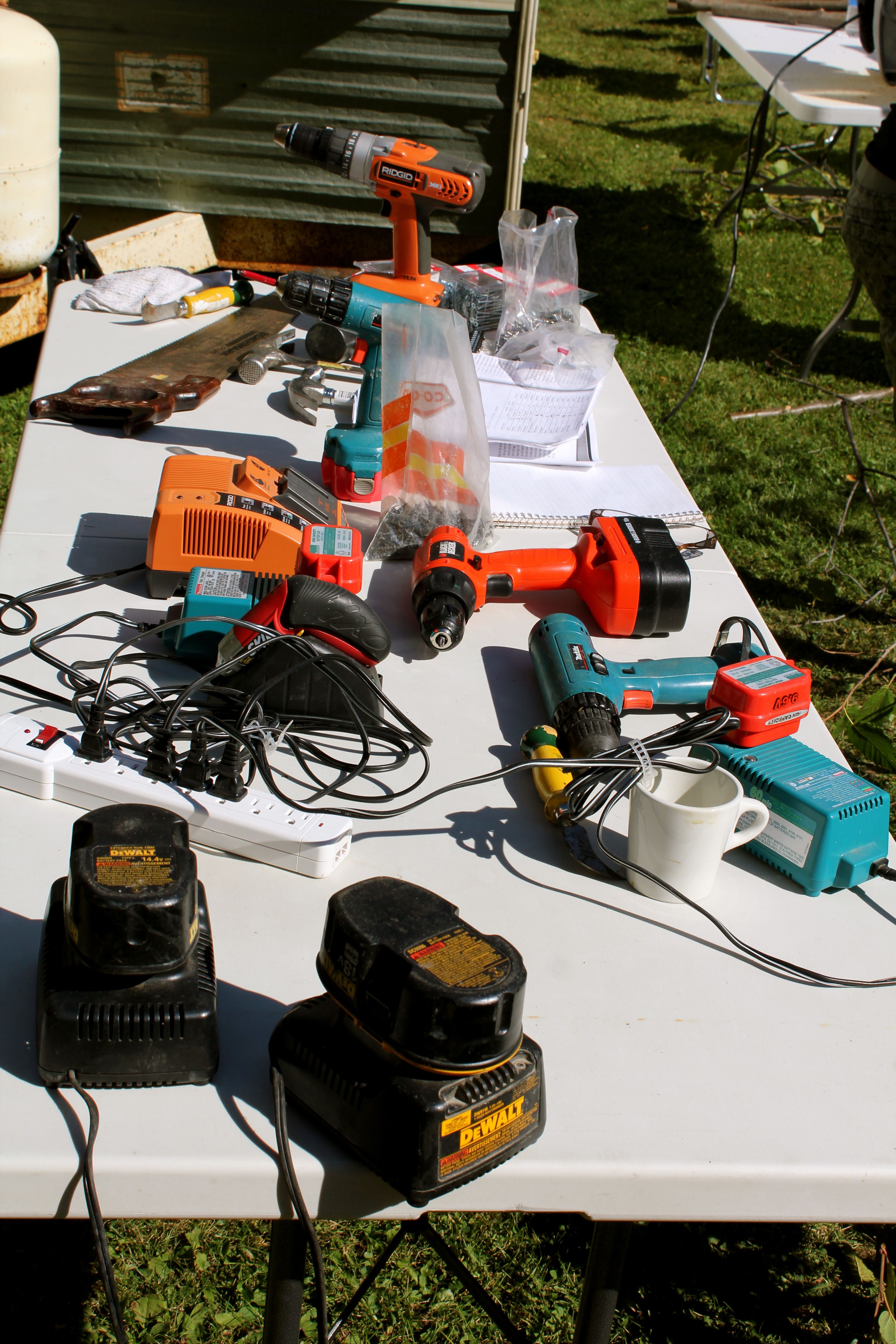 A table full of tools: drills, hammers, bits, screws, nails, pruning shears, knives, saw…
