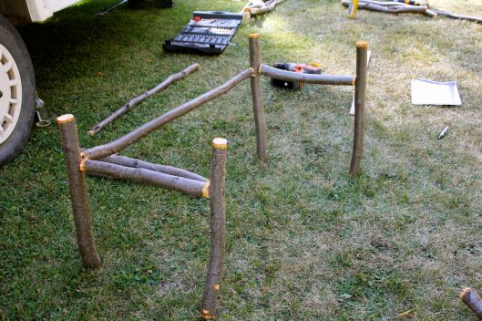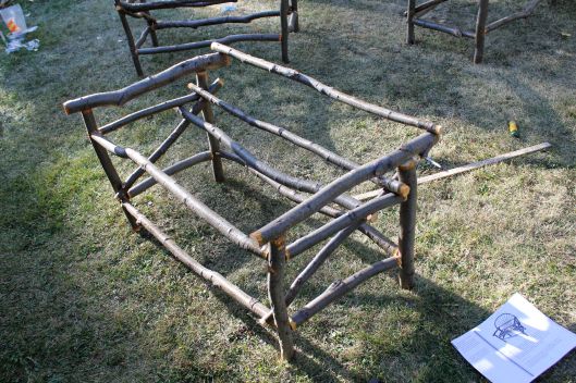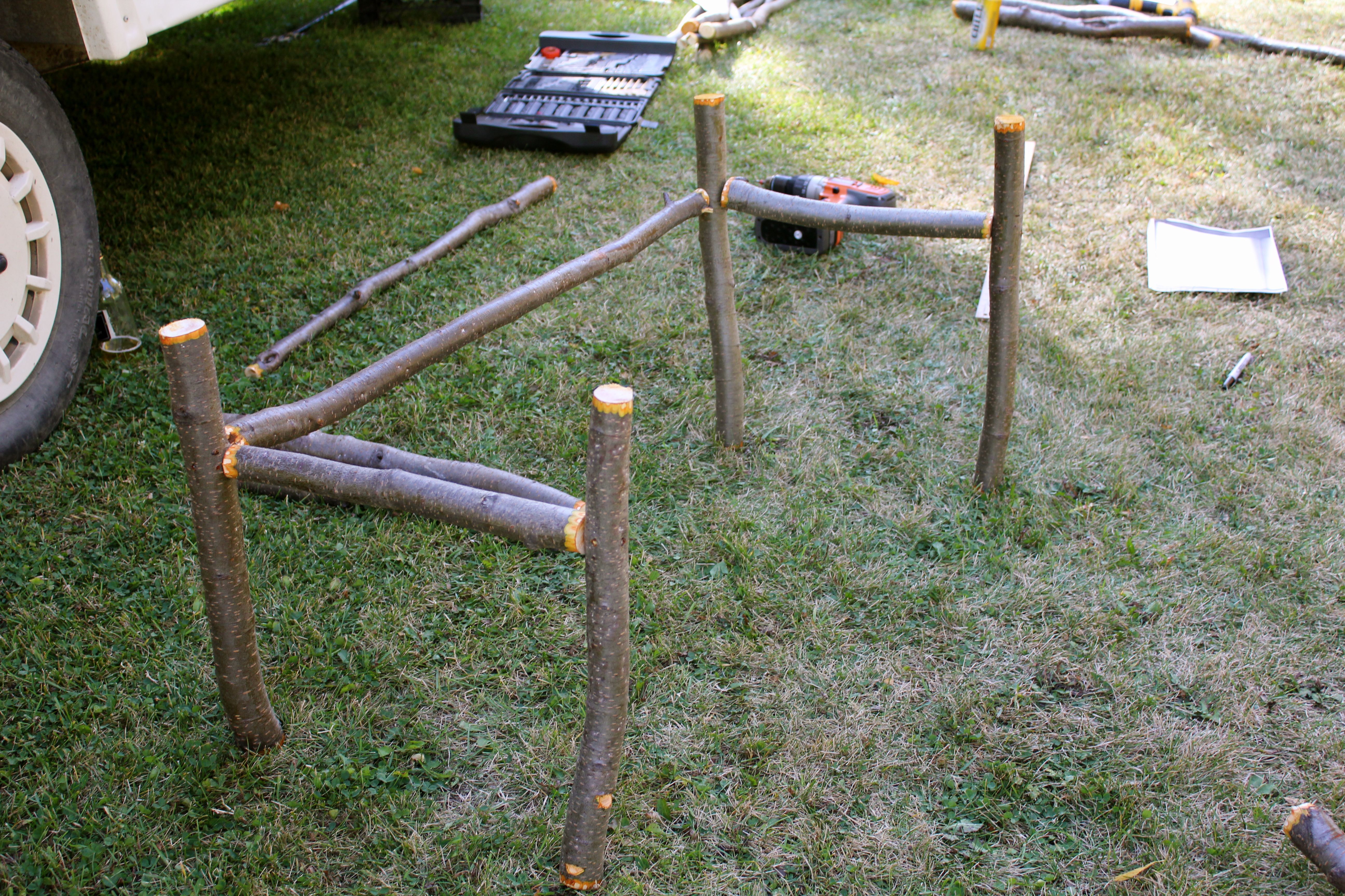 With help, we inserted the branches through the upper bracket and fastened them to the front support to form the seat.