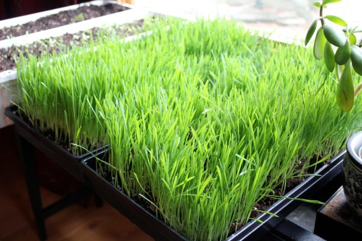 A cute story: My friends, E and M helped me plant the two trays of wheatgrass a few weeks ago. When they came over last weekend and saw the two lush trays of grass, E excitedly exclaimed, ‘When I have my own home, I’m going to plant wheatgrass in the front yard!!!’ Ahh… belly laughs…