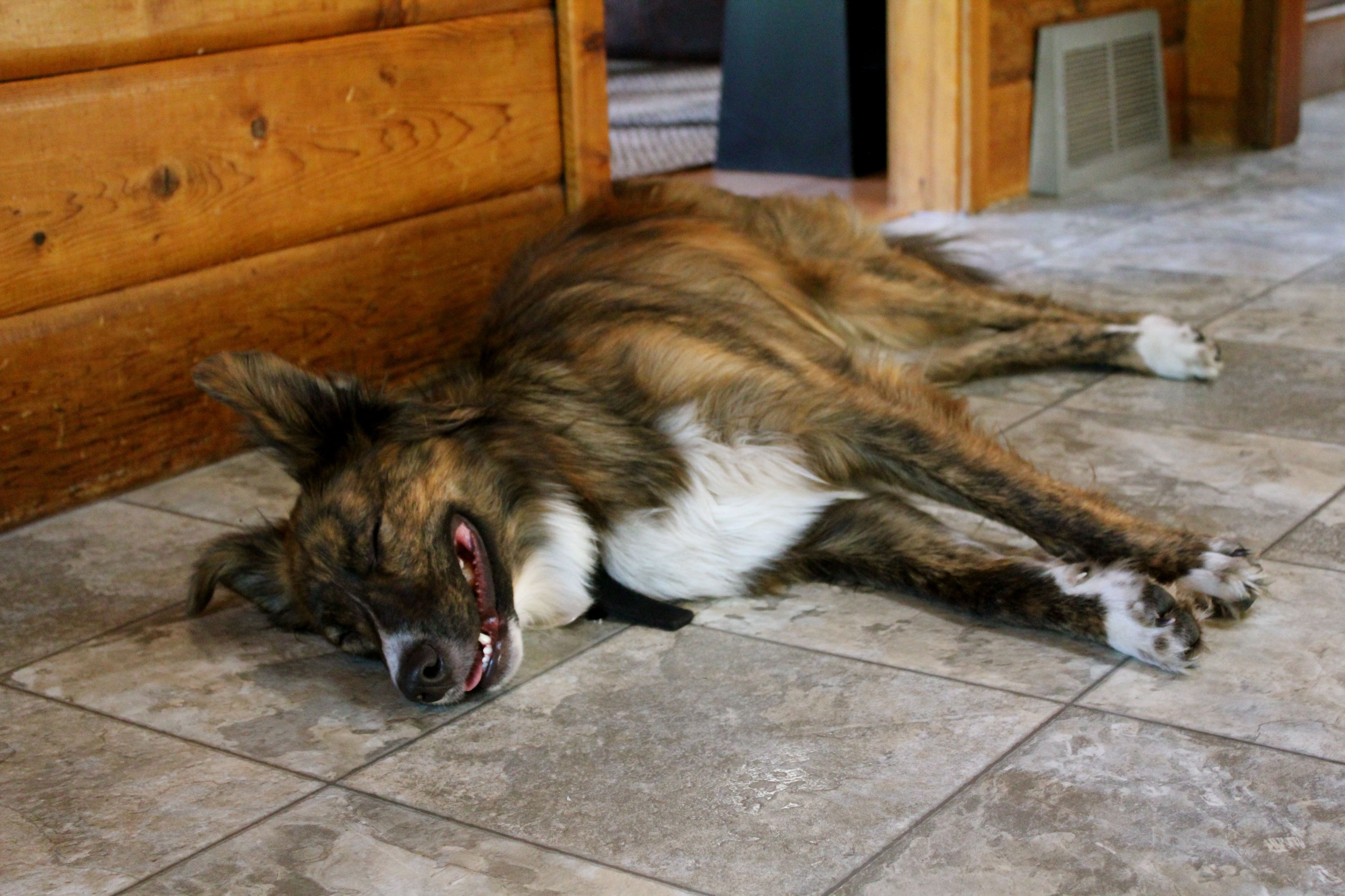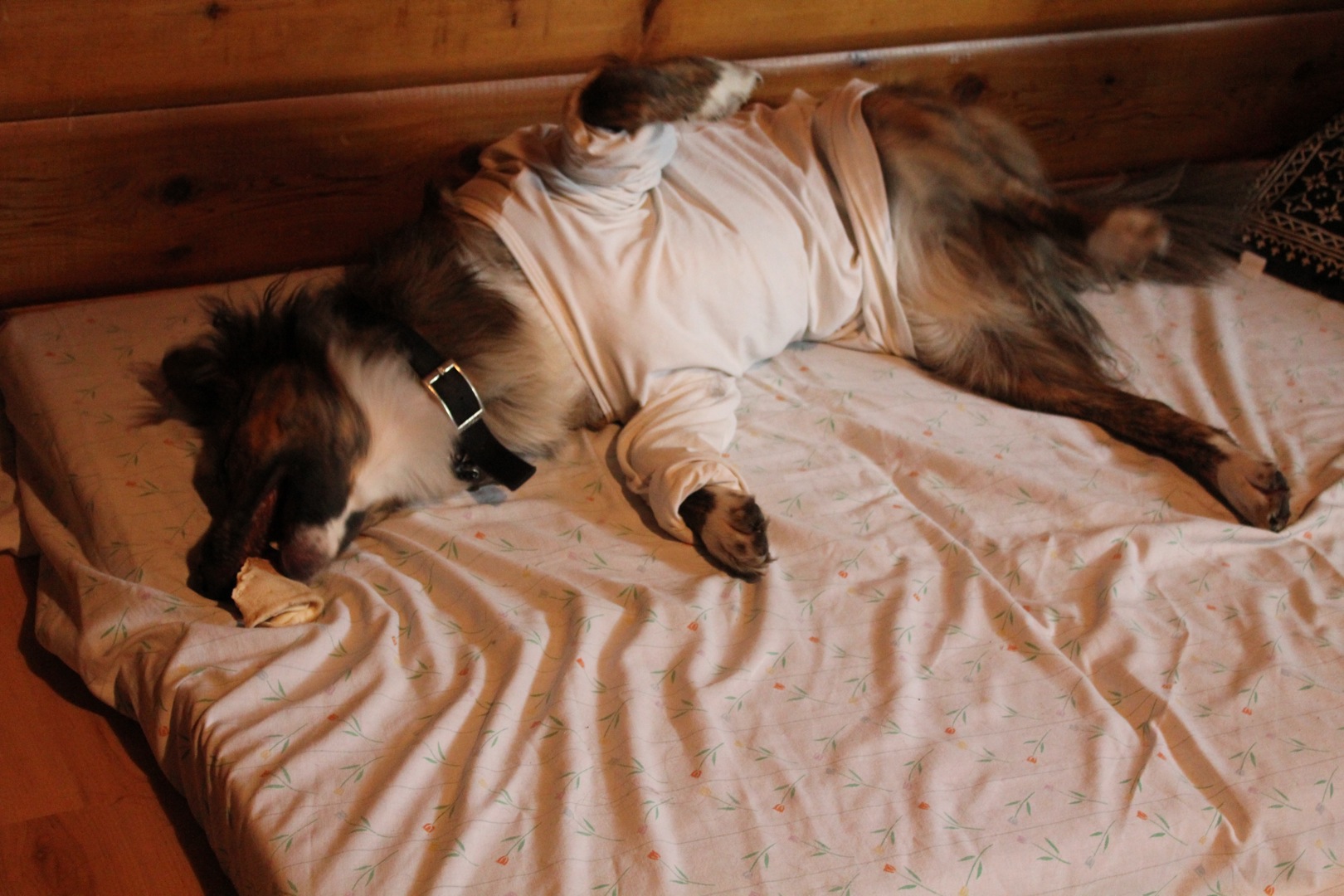 Then last Tuesday evening when we were out for our evening walk, Lucy went leaping gracefully through some tall grass as she so often does. On her third landing she suddenly started yelping and running out of the grass. I thought that perhaps a coyote had nipped her and was chasing her (we run into them often but the encounters are never threatening) so I went running towards Lucy with my hiking poles ready to defend her. As Lucy came running towards me I saw that she was holding her body posture very awkwardly and that the entire inner parts of her front legs and her chest were covered in porcupine quills! It was quite gruesome and she seemed to have morphed into some kind of spiky X-men character. She must not have smelled the porcupine in the tall grass. Perhaps the wind was blowing away from her… And judging by the location of the quills, she must have landed right smack on top of the prickly animal. Lucy looked confused and in pain as she limped toward me. Lucky we were not far from home and we slowly made our way back to the cabin.