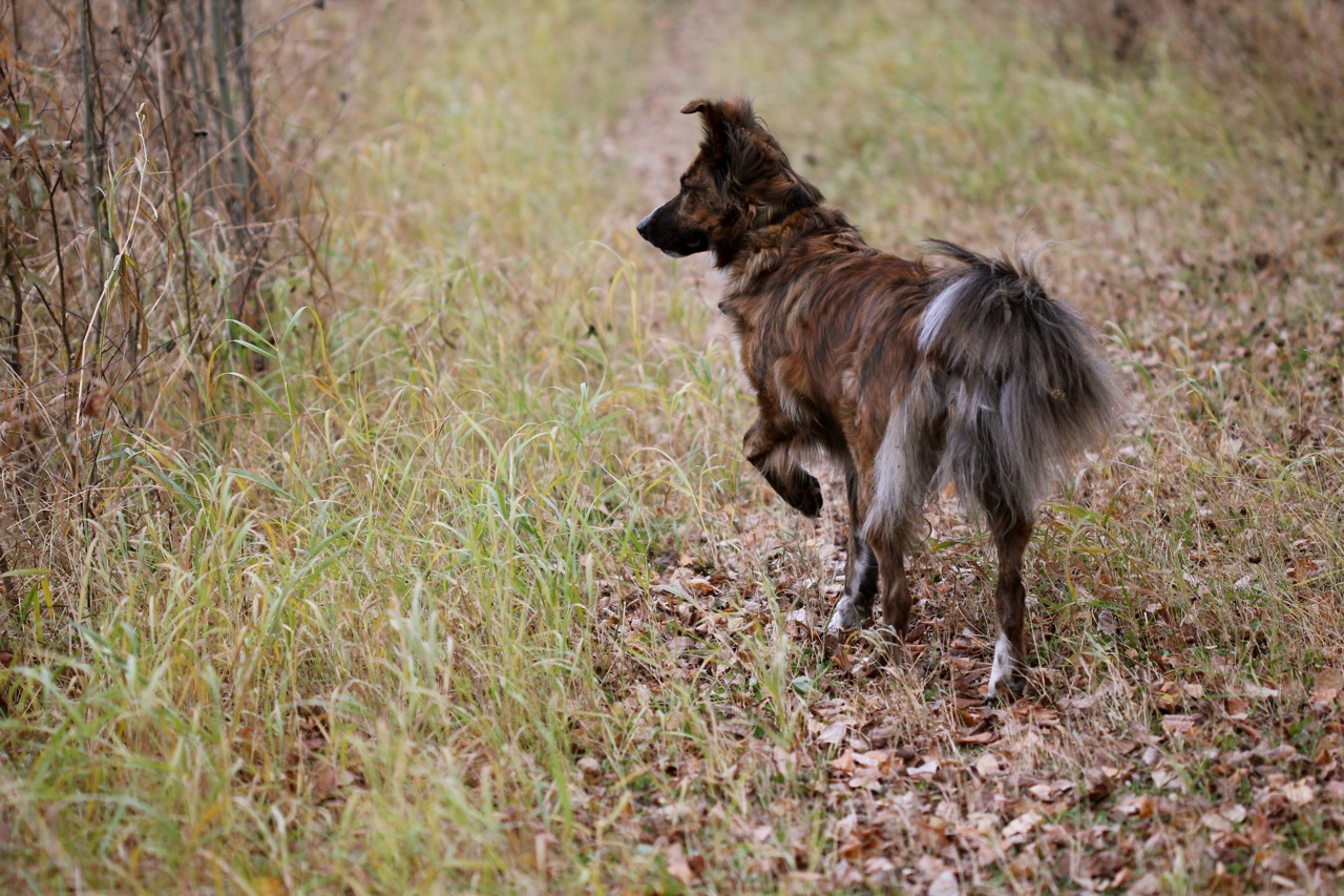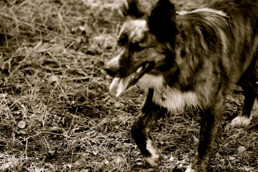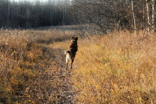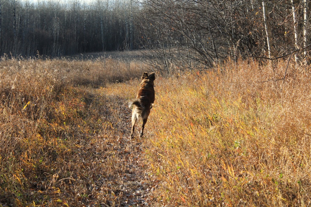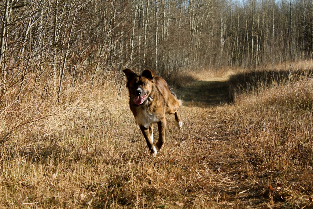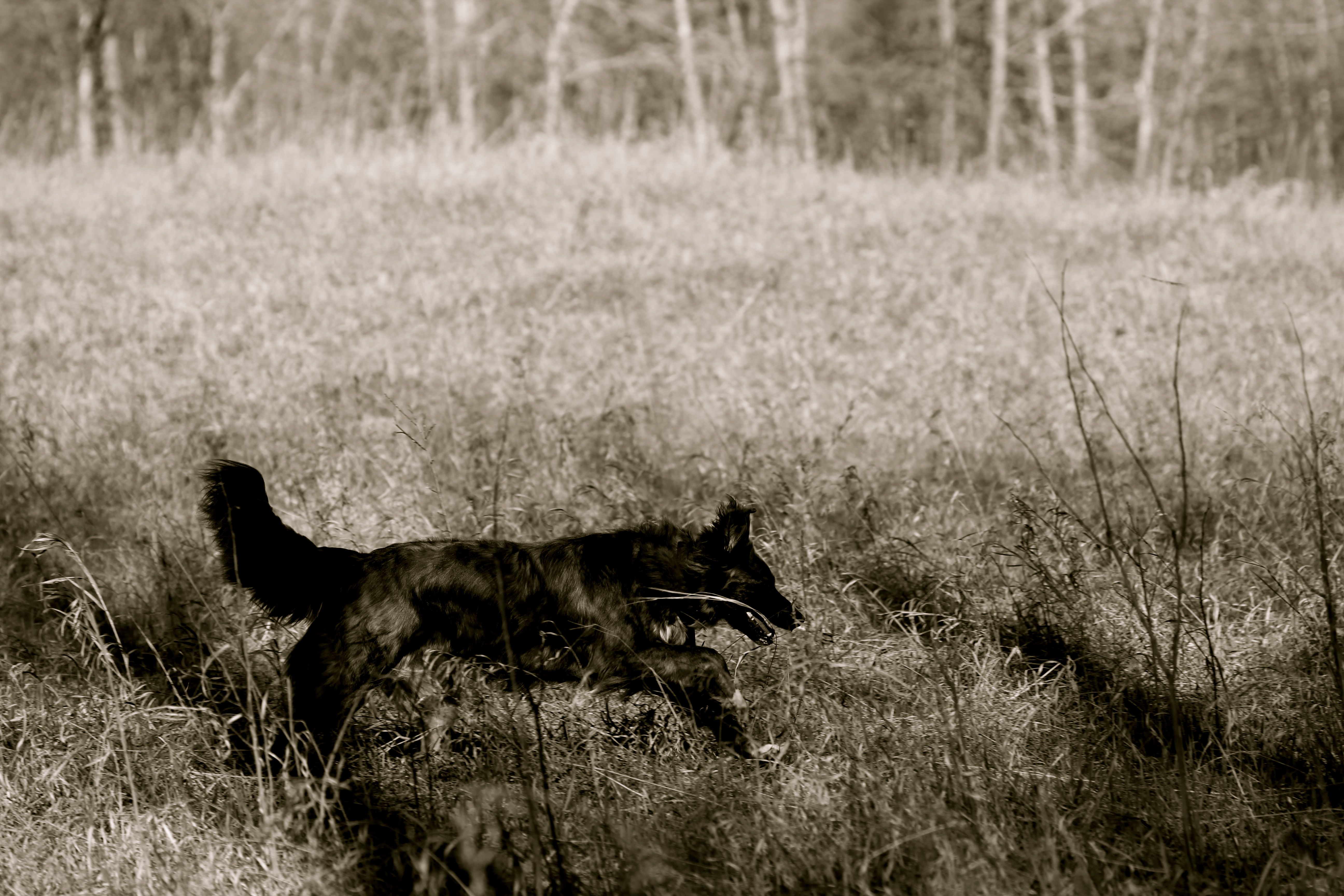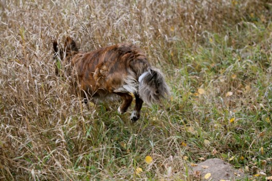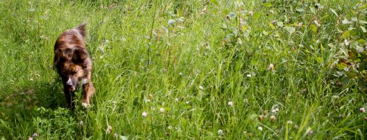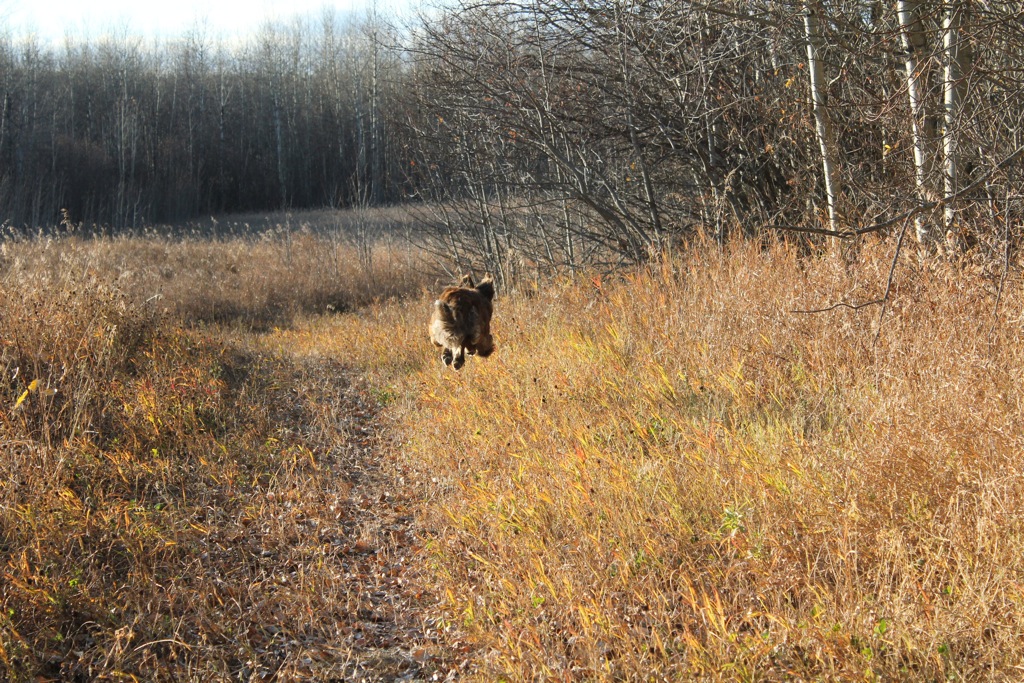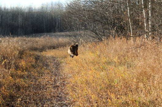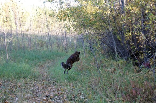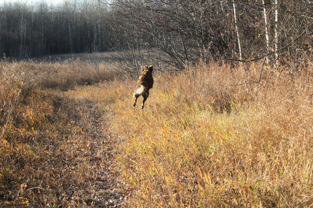 My personal favorite (though very difficult to photograph) is when she is in the field in the high grass where she completely disappears. Suddenly, she’ll start leaping, these high graceful leaps in the air, one right after another (sometimes seven in a row), tirelessly popping up like a piece of popcorn… huge smile on her face… pushing forward like a strong swimmer doing the butterfly stroke in a sea of grass…