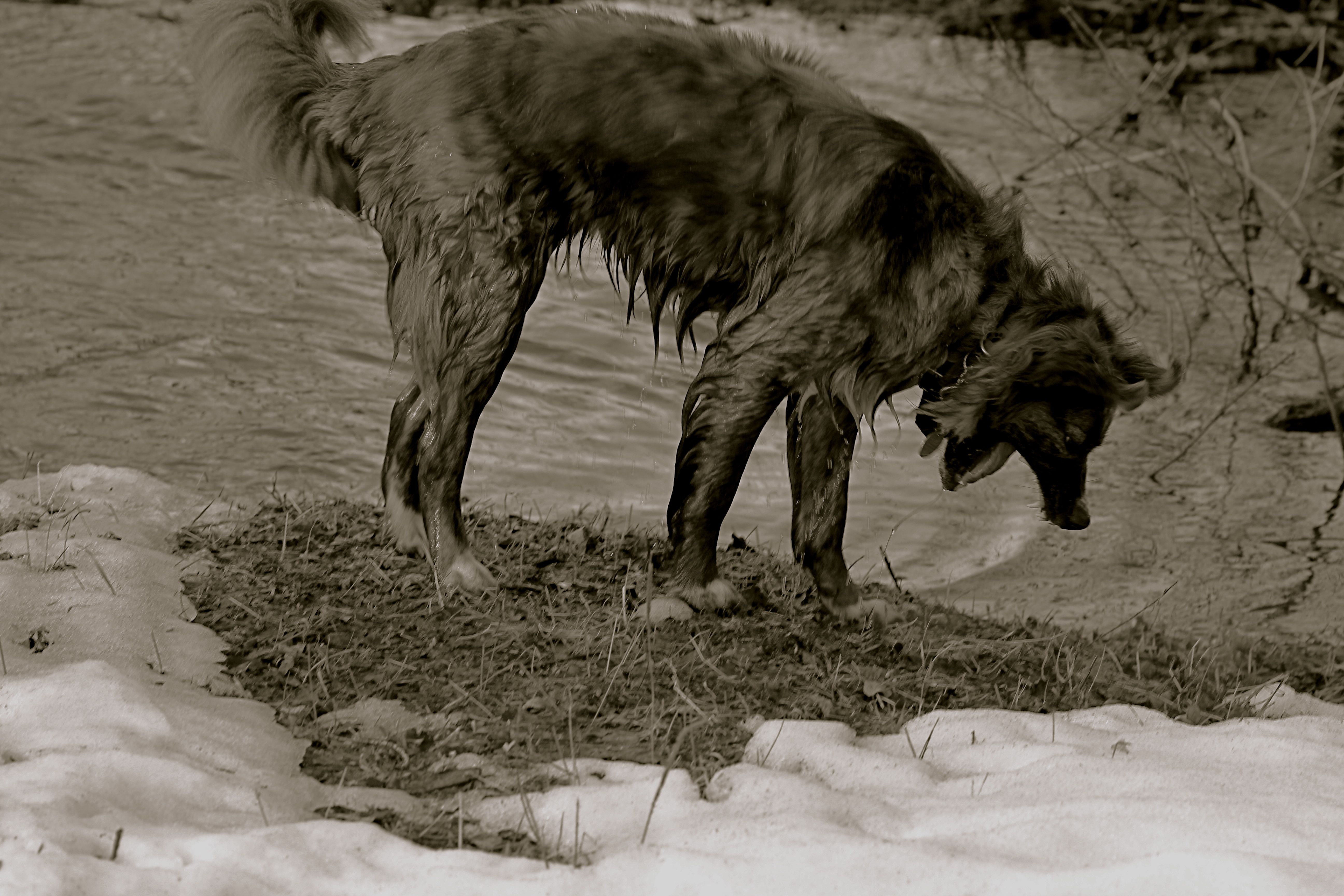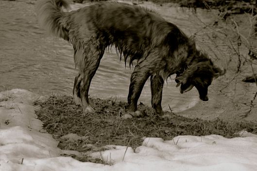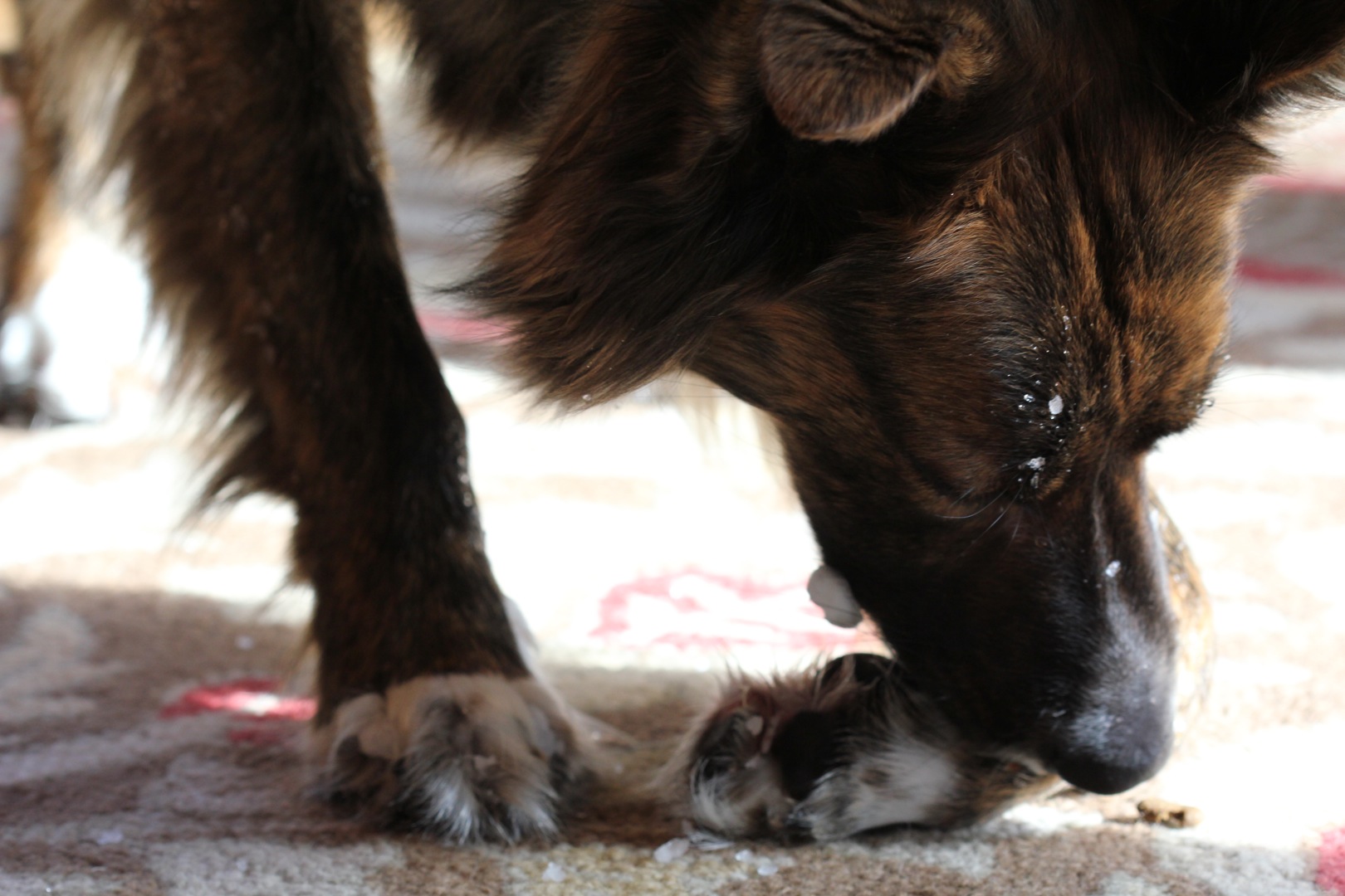 During and after the walk, Lucy often tends to the ice balls that form in her large, beautiful paws.