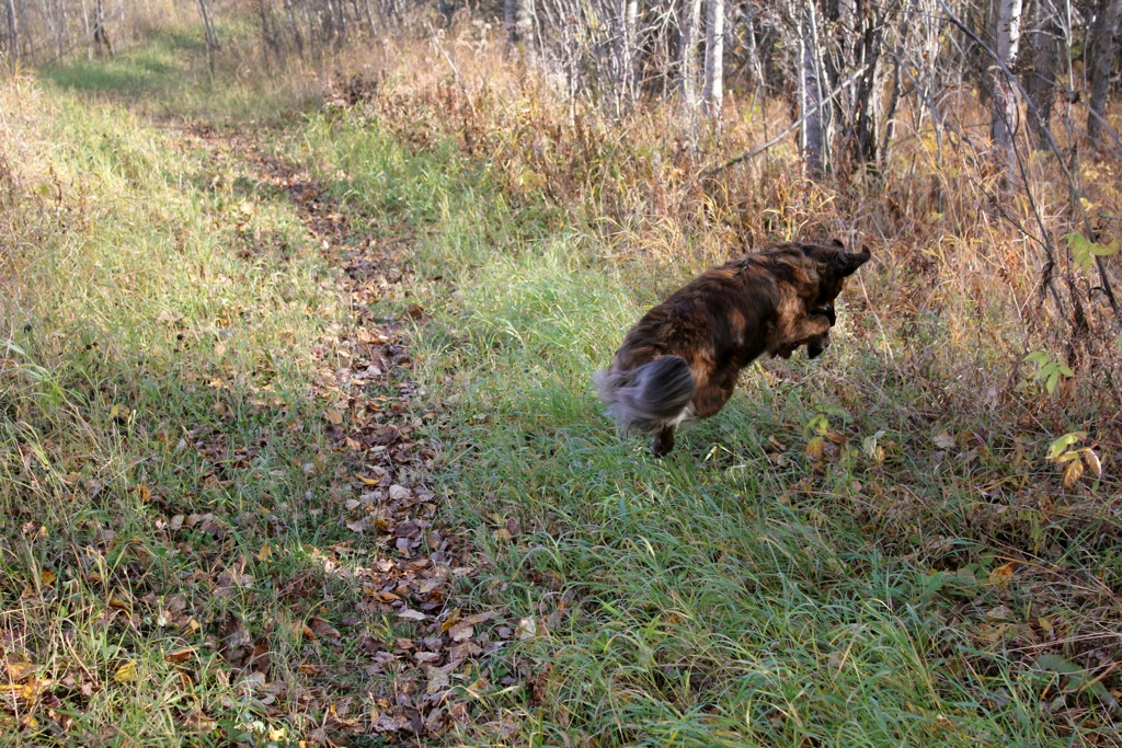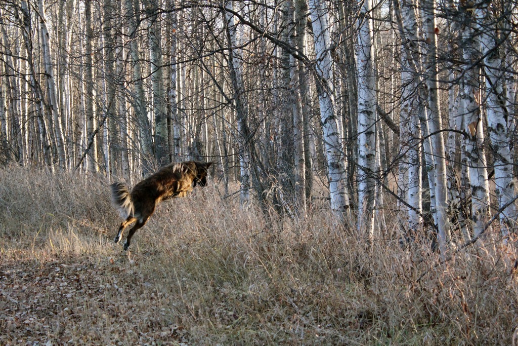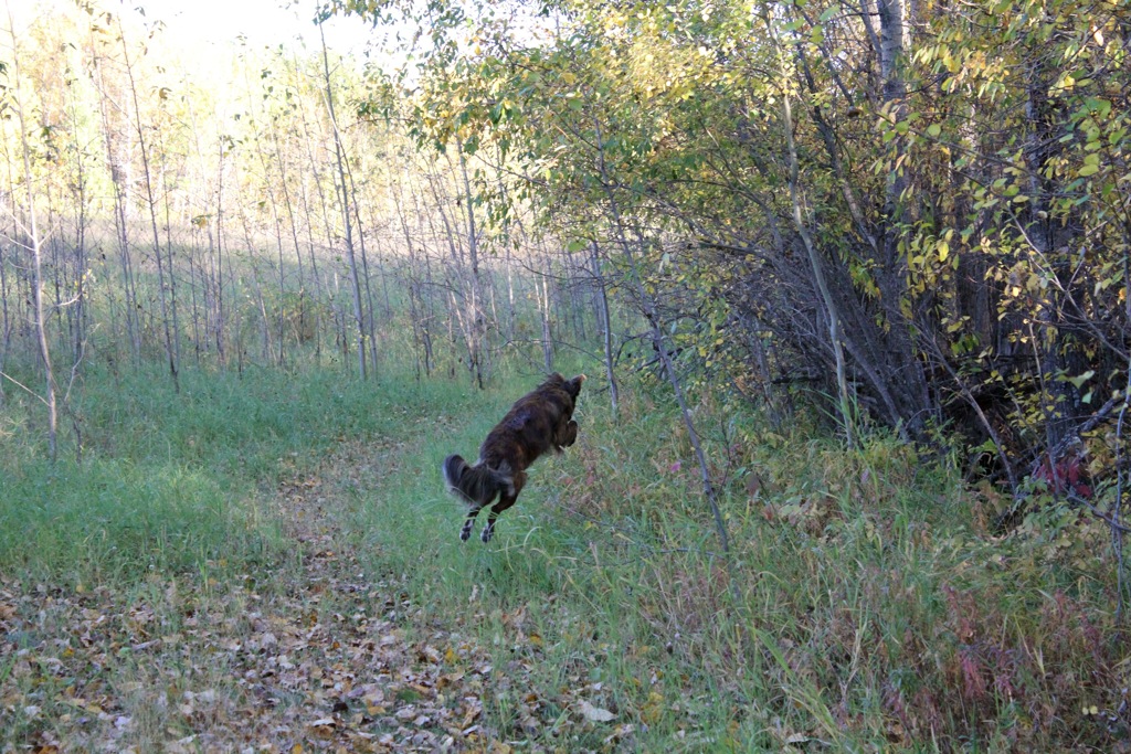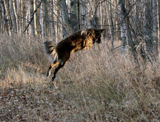 For the last two months I have been following Lucy around, camera in hand, peeping in the bushes like an annoying paparazzi trying to capture this amazing new thing that she’s been doing… Lucy has been leaping. Yes, I know that all dogs leap and jump but over the last two months, Lucy has turned into this graceful ballerina, leaping incredibly high into the air (at least 5 feet sometimes), arching her entire body and then pouncing on prey, just like a coyote or fox.