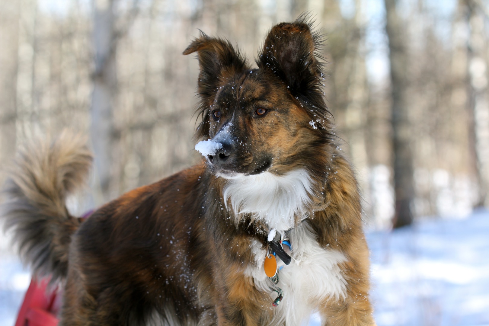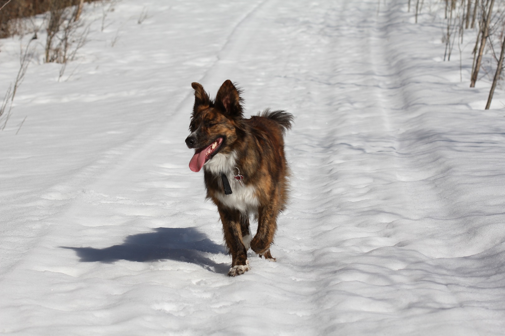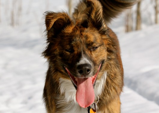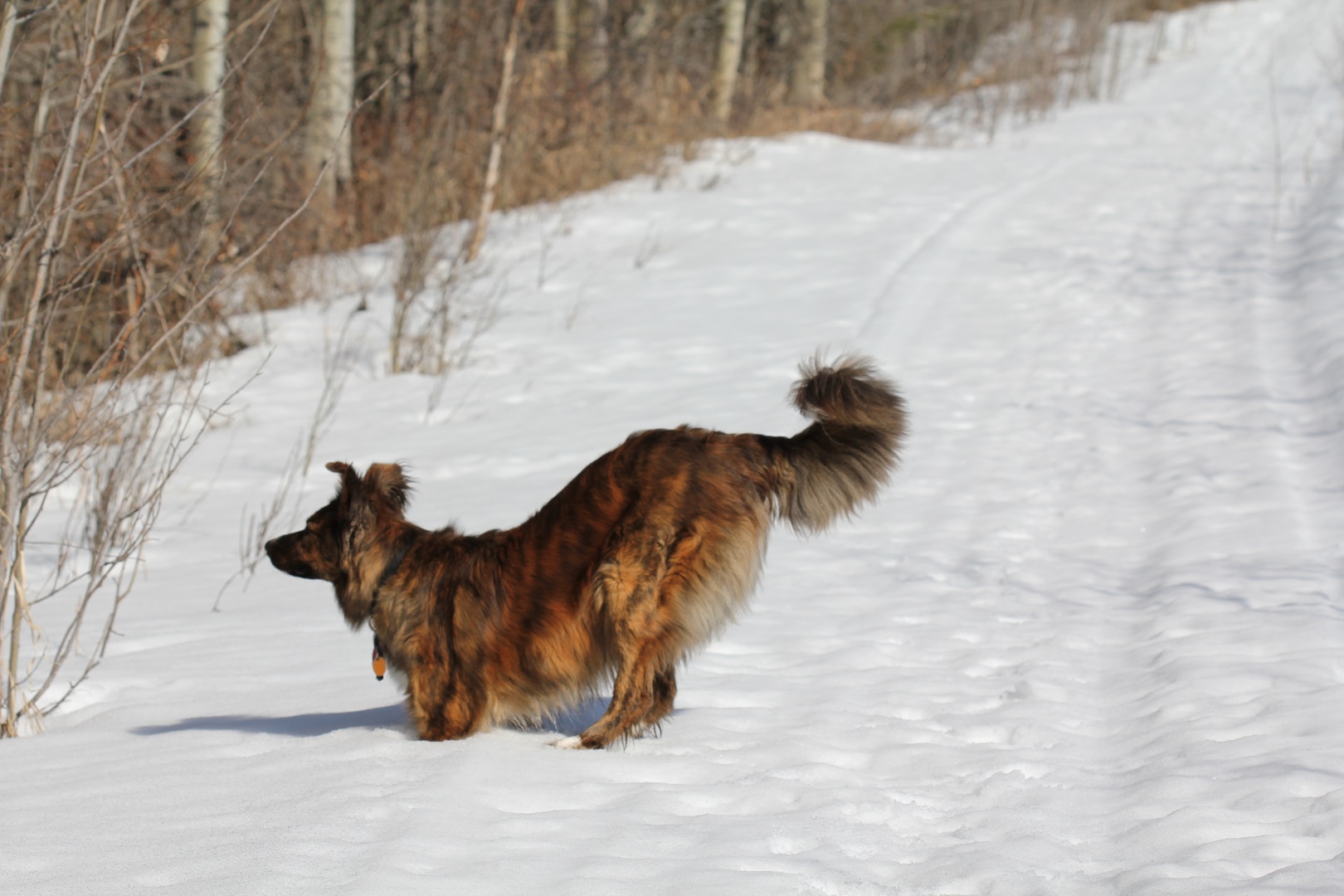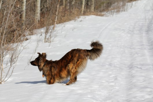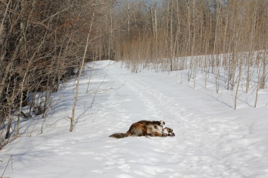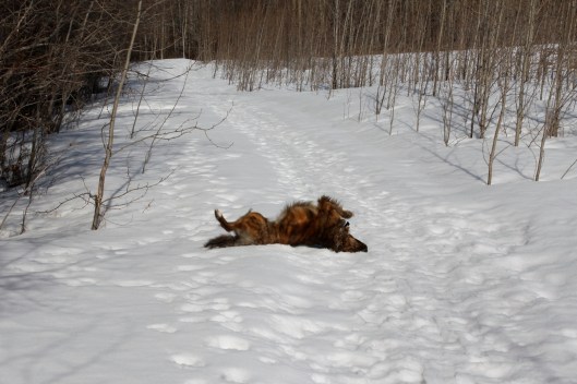 Of course, like most dogs, she also loves rolling in the snow, picking up the scent of whatever was left behind by some other animal. I tease her and tell her that she’s ‘putting on her perfume’. Usually she smells quite sweet and clean when she rolls in the snow, but once in a while she’ll roll in something raunchy (like a dead frog in summer or coyote scat) and then I’m a little more reluctant to cuddle with her later!