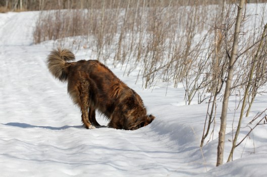 Lucy’s hunting is very fox-like and I found a very interesting podcast recently from CBC’s Quirks and Quarks, which talks about the leaping behavior of the Red Fox. Apparently, they become very still and locate the prey by sound and/or sight. Then they leap up high in the air and pounce on the prey. Scientists have found that they have a 74% success rate when they align their pouncing with magnetic north (which they apparently ‘see’) and only a 13% success rate when leaping randomly in other directions. Here is another website with a great article and incredible video of a fox capturing ‘invisible’ prey under deep snow. Although not as adept as this fine fox, Lucy also loves to screw her face and whole body into deep snow, so I love watching this.
