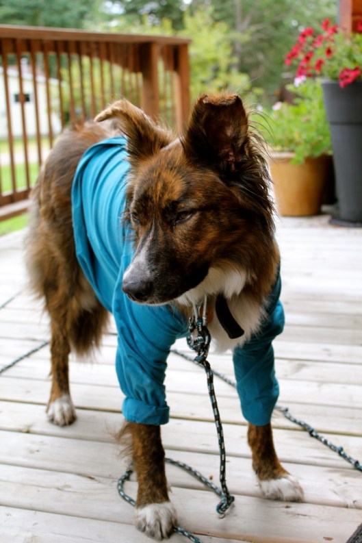 Do you remember last summer when Lucy had a hotspot on her leg and I had to make her wear shirts (and a cone at night) to stop her from licking it? Seeing as we are both redheads, she actually looks pretty good in my clothes!