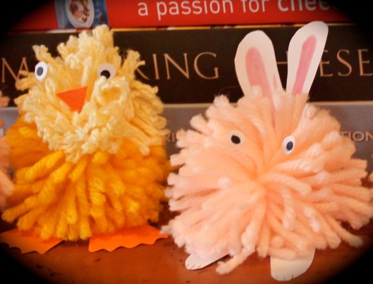 On Good Friday I received a phone call from my good friend, E. She had an Easter craft and could the kids come over to make it with me? E, J arrived first and the three of us followed E along as she modeled how to make pom poms. Later the boys, M and M arrived. We had a great afternoon, chatting, getting caught up on each other’s lives while we did our craft. By the end of our time together we each had a bunny and a chick to take along with us.